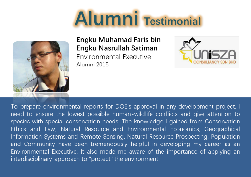 Thi Natural resources (biotic and abiotic) are important for the preservation of ecosystem structure and function. Natural resources such as biodiversity are very important as genetic resources to ensure food security. Earth’s resources such as quarrying and mining materials are important in driving development and the nation’s economy. Therefore, the exploration of natural resources needs to be balanced between sustainable use and conservation to minimize environmental degradation and destruction. In line with the Sustainable Development Goals (SDGs), students will be exposed to Green Economy that is low in carbon, reduces pollution, improves energy efficiency, prevents the loss of biodiversity and protects ecosystem services. Among the issues that will be discussed are the food security crisis; climate change; pathogen, pest and disease outbreaks that affect public health. Students will be trained to identify the uses of natural resources and understand the formation and sustainable management of resources. This course will also discuss the latest technology related to IR4.0 in the exploration and management of natural resources.