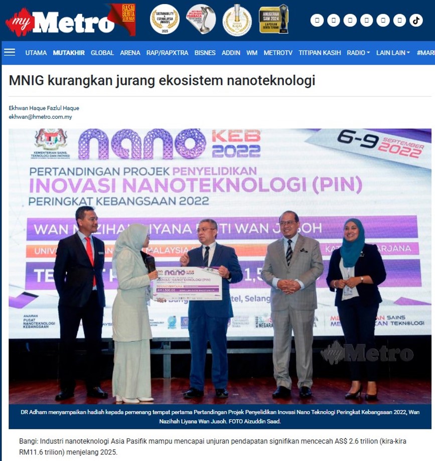 Adding to this proud moment, her success was also featured in Harian Metro on 9 September 2022, in an article emphasizing MOSTI’s efforts to reduce the gap within Malaysia’s nanotechnology ecosystem (MNIG) and strengthen collaboration between academia, industry, and government sectors. Her achievement embodies this vision, showcasing how local researchers are driving innovation toward a sustainable and technology-driven future.