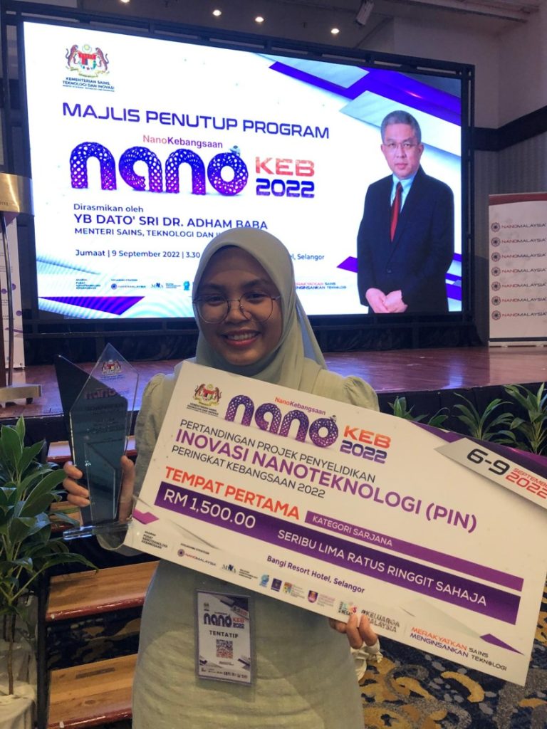 We are delighted to celebrate the remarkable achievement of Mrs. Wan Nazihah Liyana Wan Jusoh, who won a first place at the Projek Inovasi Nanoteknologi (PIN) 2022 organized by the Ministry of Science, Technology and Innovation (MOSTI). The competition was held at Bangi Resort Hotel from 6 to 9 September 2022, bringing together researchers and innovators from across Malaysia to showcase cutting-edge advancements in nanotechnology.