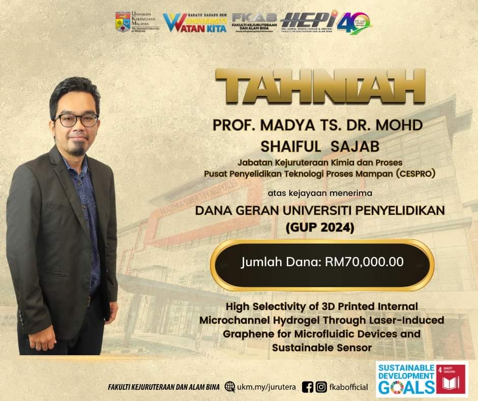 We are thrilled to announce that Assoc. Prof. Mohd Shaiful Sajab, our esteemed lead researcher, has been awarded a research fund of RM 70,000. This funding will support his groundbreaking project titled “High Selectivity of 3D Printed Internal Microchannel Hydrogel Through Laser-Induced Graphene for Microfluidic Devices and Sustainable Sensors.”
