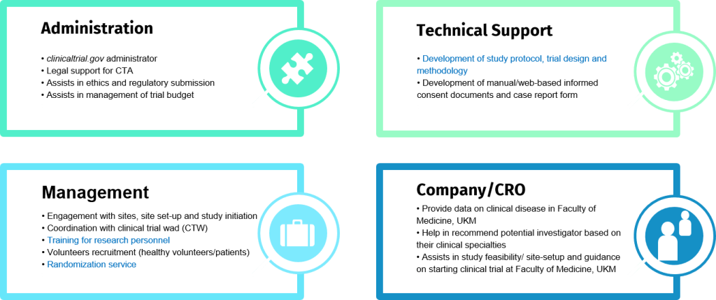Clinical Trial Unit (CTU), Faculty of Medicine, UKM is a unit that was newly established in 2019 under the Secretariat of Research and Innovation (SPI). This unit is headed by Associate Prof Dr. Jemaima Che Hamzah. Our main goals are to centralize the management of clinical trial studies especially in Faculty of Medicine and to ensure studies are conducted according to set quality.