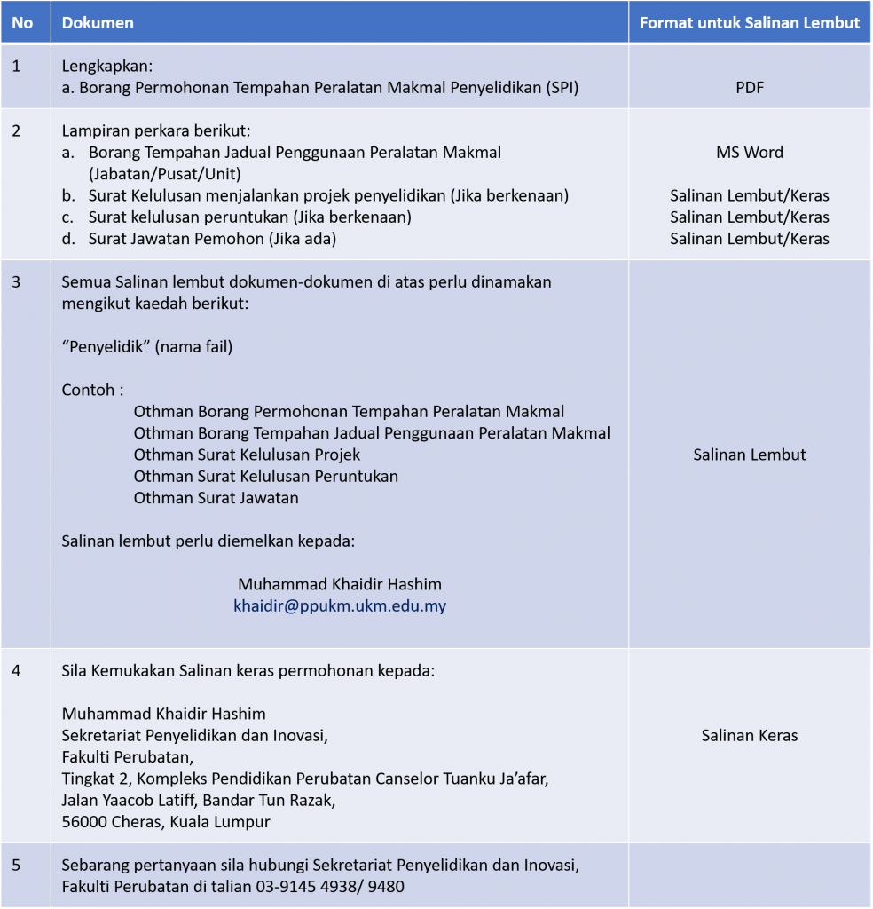 Setiap permohonan tempahan peralatan makmal penyelidikan perlu melengkapkan dan menghantar 1 salinan keras serta salinan lembut semua dokumen seperti di bawah: