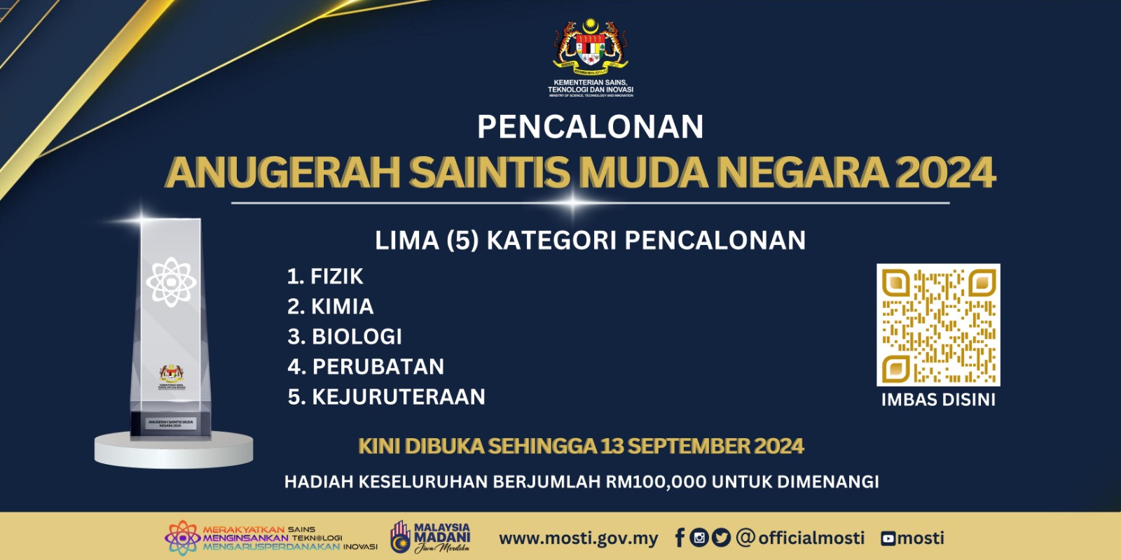 Perincian lebih lanjut mengenai syarat-syarat dan peraturan Anugerah Saintis Muda Negara Tahun 2024 bagi kategori Biologi, Fizik, Kimia, Perubatan dan Kejuruteraan serta urusan pencalonan adalah secara atas talian pada pautan www.tinyurl.com/AnugerahSaintisMudaNegara2024. Pencalonan perlu memuat turun fail Dokumen Pencalonan Anugerah Saintis Muda Negara 2024. Pencalonan berserta dokumen lengkap hendaklah dikemukakan melalui emel kepada muhammadmuaz@mosti.gov.my sebelum atau pada 13 September 2024 (Jumaat).