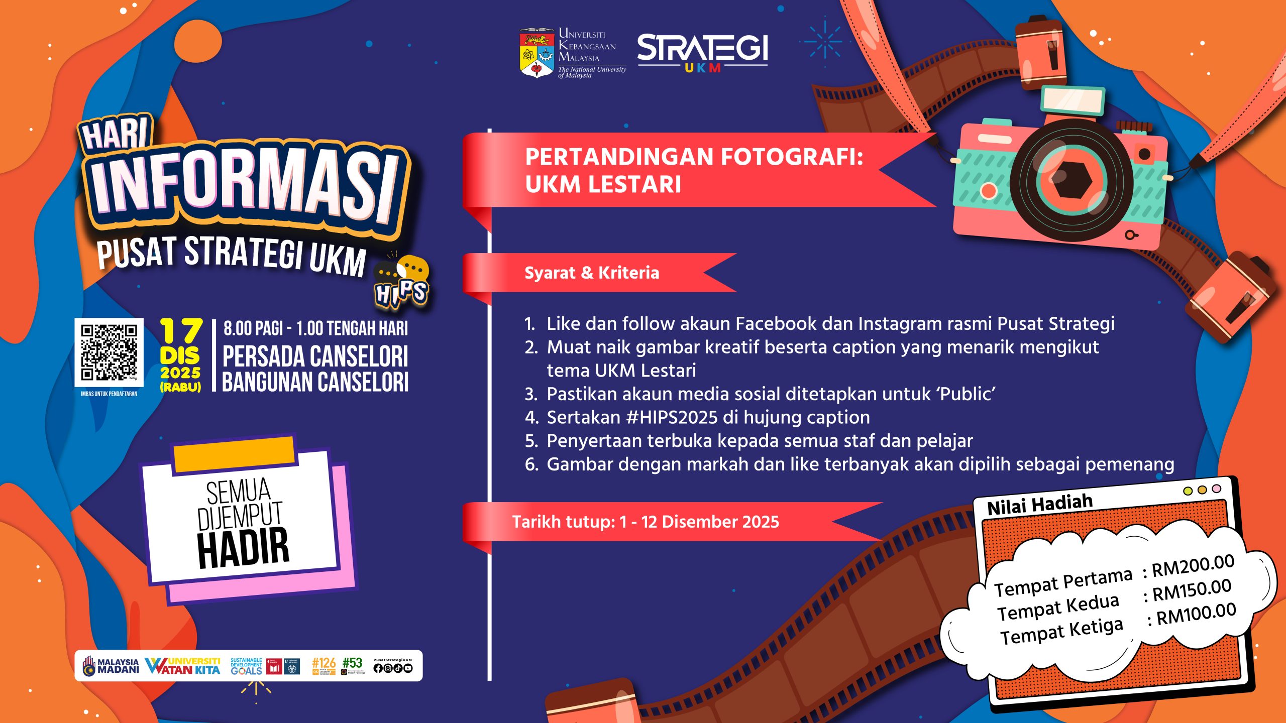Penganjuran pertandingan ini juga adalah bersempena dengan Hari Informasi Pusat Strategi UKM yang akan diadakan pada 17 Disember 2025. Tarikh tutup penyertaan adalah sebelum atau selewatnya pada 12 Disember 2025 (Jumaat) jam 5.00 petang.