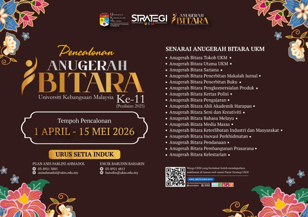 Sehubungan itu, Pusat Strategi UKM selaku Sekretariat Anugerah UKM dengan sukacitanya mempelawa Warga UKM yang berminat untuk mengemukakan pencalonan bagi Anugerah Bitara UKM Ke-11 (Penilaian 2025).