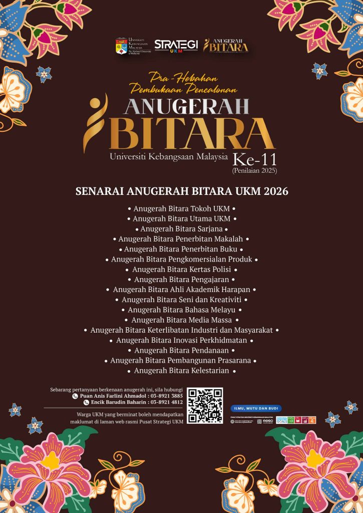 Sehubungan dengan itu, Pusat Strategi UKM selaku Sekretariat Anugerah UKM dengan sukacitanya mempelawa semua warga UKM yang berminat untuk menghantar pencalonan bagi Anugerah Bitara UKM. Borang pencalonan akan dihebahkan setelah pencalonan dibuka tidak lama lagi. Buat masa ini syarat, kriteria dan maklumat lanjut boleh didapati di laman sesawang Pusat Strategi UKM.