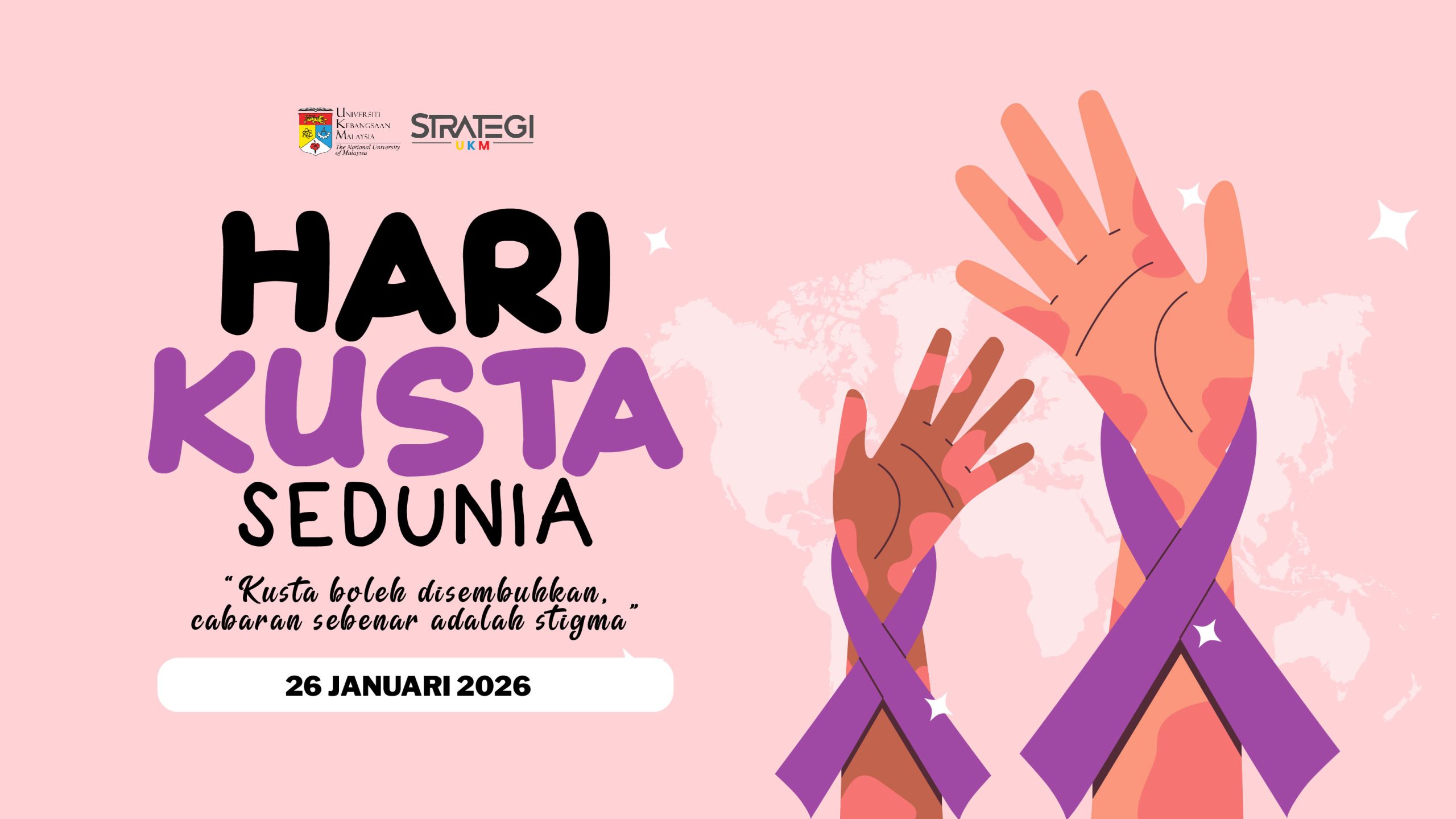 Hari Kusta Sedunia pada 26 Januari 2026 merupakan satu usaha berterusan untuk meningkatkan kesedaran masyarakat terhadap Penyakit Kusta. Penyakit ini disebabkan oleh bakteria Mycobacterium leprae yang boleh menyerang kulit, saraf tangan dan kaki, serta organ lain seperti mata dan hidung. Diagnosis awal dan rawatan yang sempurna amat penting kerana ia bukan sahaja membantu pesakit menjalani kehidupan yang lebih baik, malah berupaya mencegah penularan penyakit ini.