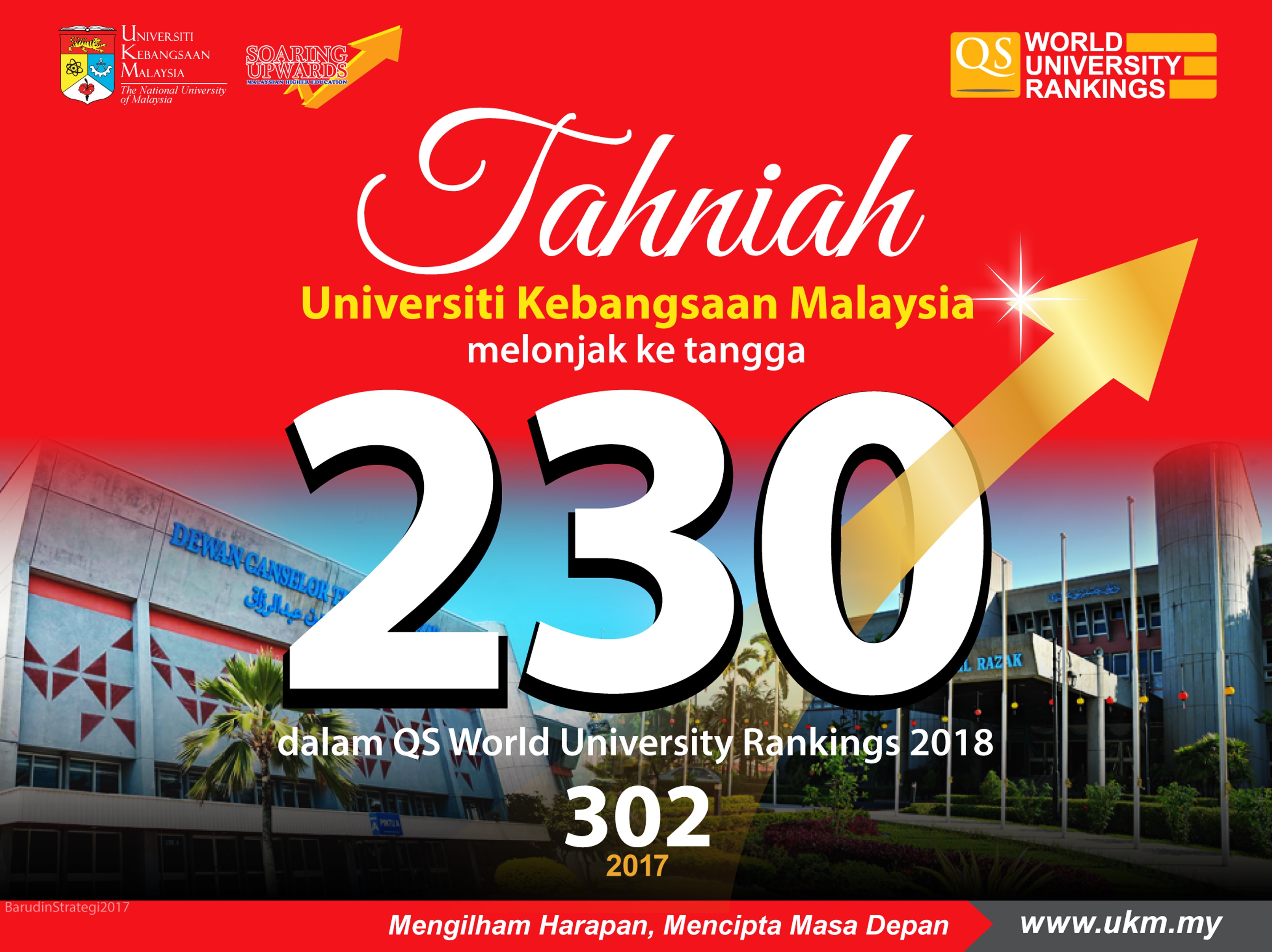 Tahniah UKM mencatat peningkatan penarafan yg tertinggi sebanyak 72 anak tangga di kedudukan ke 230 dalam QS World University Rankings 2018 berbanding tahun lepas iaitu di kedudukan ke 302.