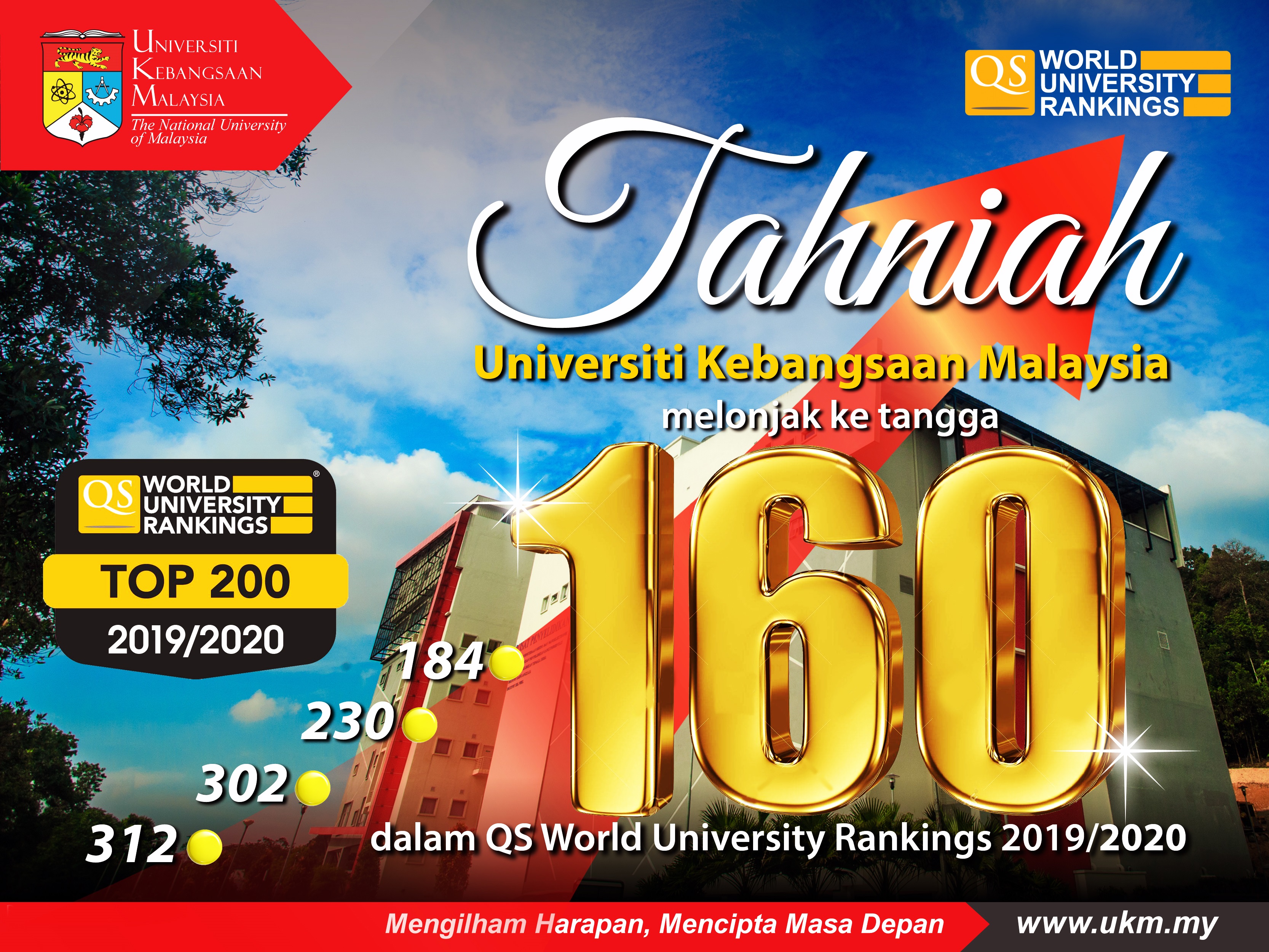 Tahniah UKM di kedudukan ke 160 dalam QS World University Rankings 2019/2020 melonjak 24 tangga berbanding tahun lepas iaitu di kedudukan ke 184. UKM tersenarai di 200 Universiti Terbaik di dunia.