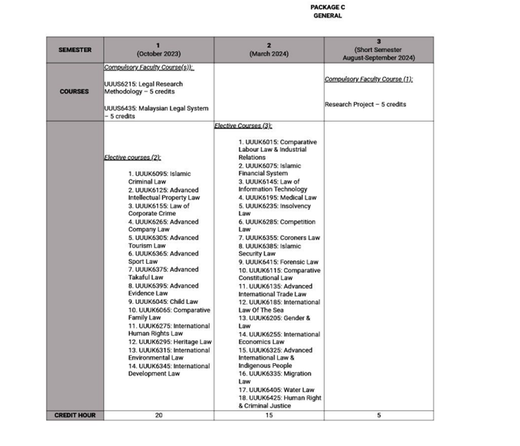 • A bachelor’s degree in Law or Syariah or a bachelor’s degree in any field that has a legal or Syariah component from Universiti Kebangsaan Malaysia or other universities approved by the Senate with a minimum Cumulative Grade Point Average (CGPA) of 2.50 out of 4.0 or its equivalent as accepted by the Senate; or