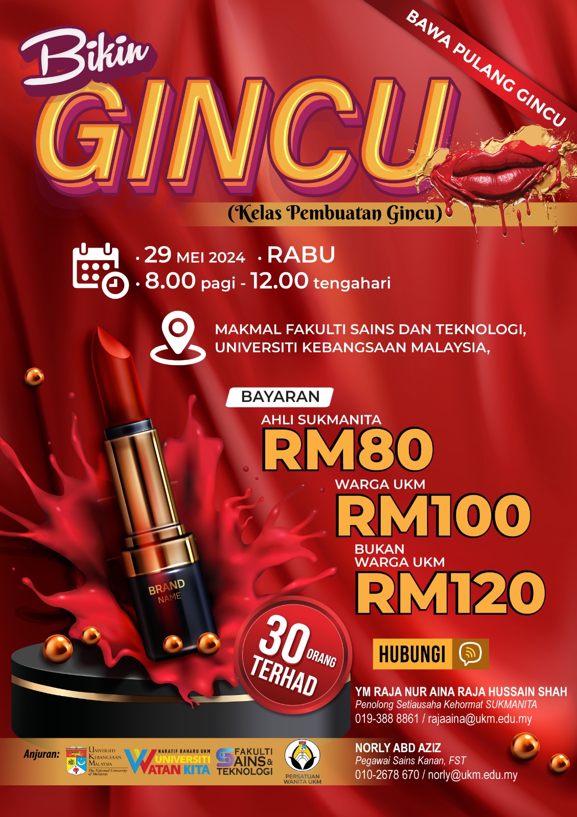 Fakulti Sains dan Teknologi bekerjasama dengan SUKMANITA akan mengadakan kursus Jom Bikin Gincu pada 29 Mei 2024.