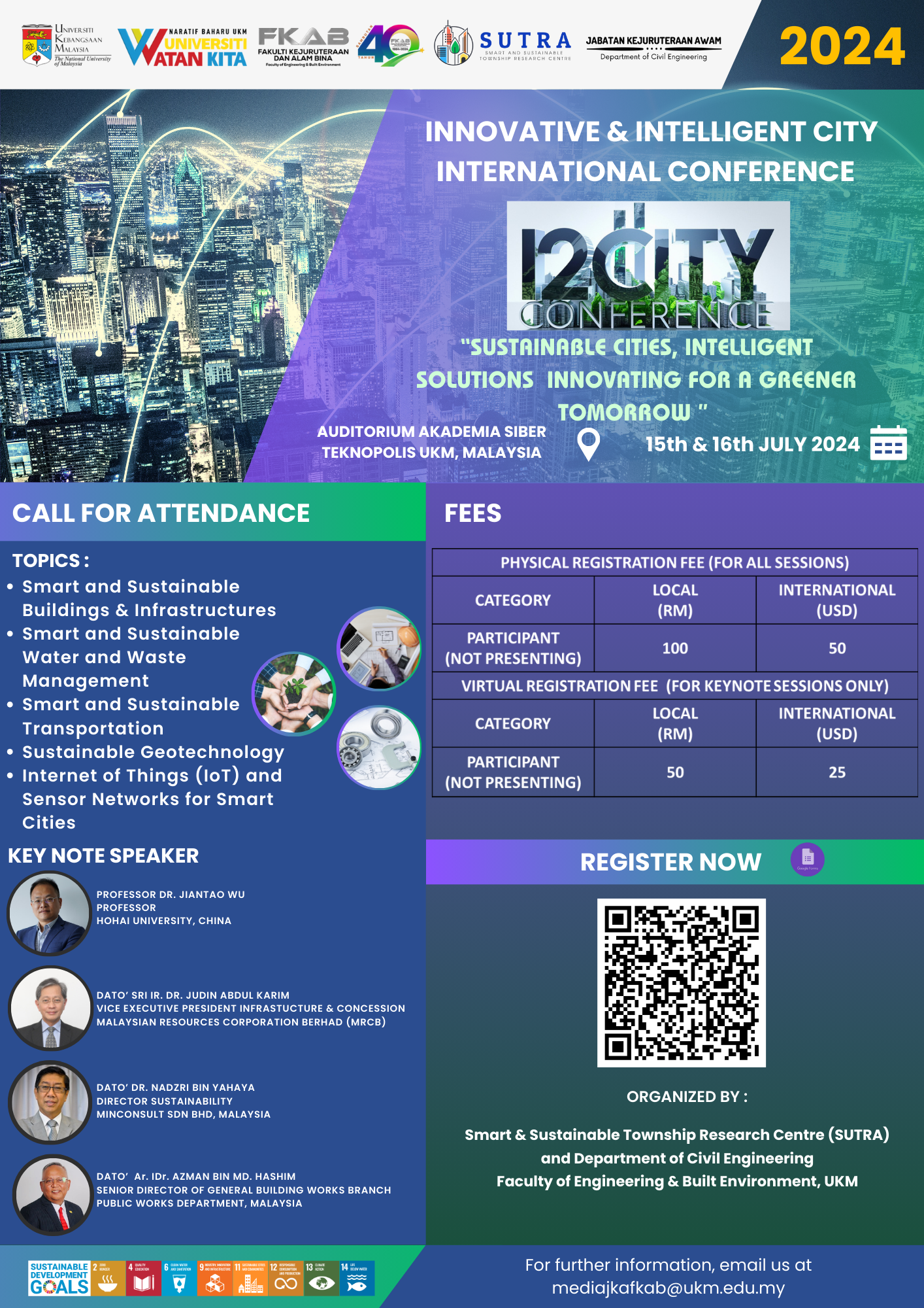 Innovative Intelligent City International Conference 2024 (I2CITY2024) is held to give exposure and opportunity to final year undergraduate students and graduate students of the Civil Engineering Program to share and present the results of their research projects. The I2CITY 2024 conference also serves as a platform to explore the latest innovations, share best practices and form collaborations aimed at creating smart and sustainable cities.