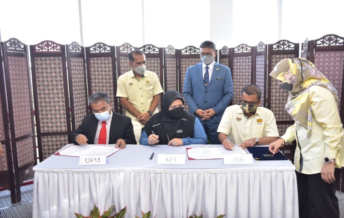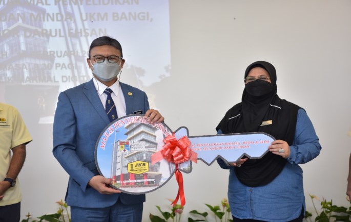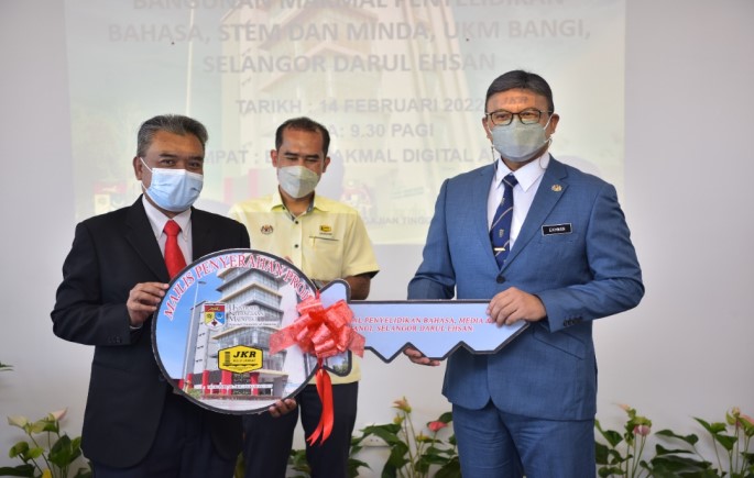 BANGI, 14 Februari 2022 – Universiti Kebangsaan Malaysia (UKM) secara rasminya telah menyelesaikan projek pembinaan bangunan Makmal Penyelidikan Bahasa, Media dan STEM yang bertempat di Kampus Bangi, Selangor. Majlis disempurnakan oleh Timbalan Pengarah Jabatan Kerja Raya (JKR) Selangor, Ir. Mohd Zawawi Zakaria melalui penyerahan replika kunci sebagai simbolik penyerahan bangunan baharu tujuh tingkat yang berkonsepkan moden kontemporari ini. Projek pembinaan bangunan ini menerima peruntukan sebanyak RM23 juta di bawah Rancangan Malaysia Ke-11 (RMK-11), Kementerian Pengajian Tinggi Malaysia.