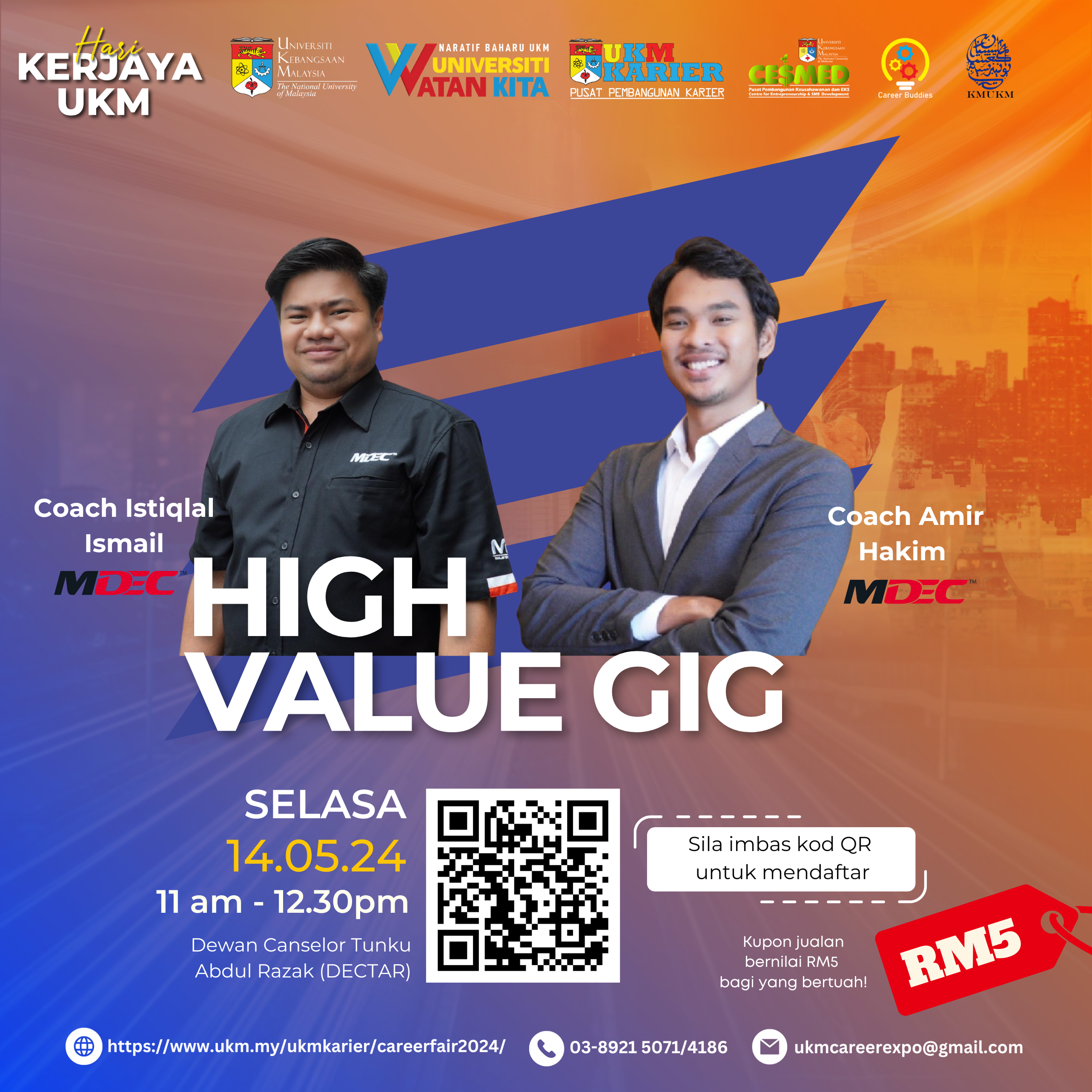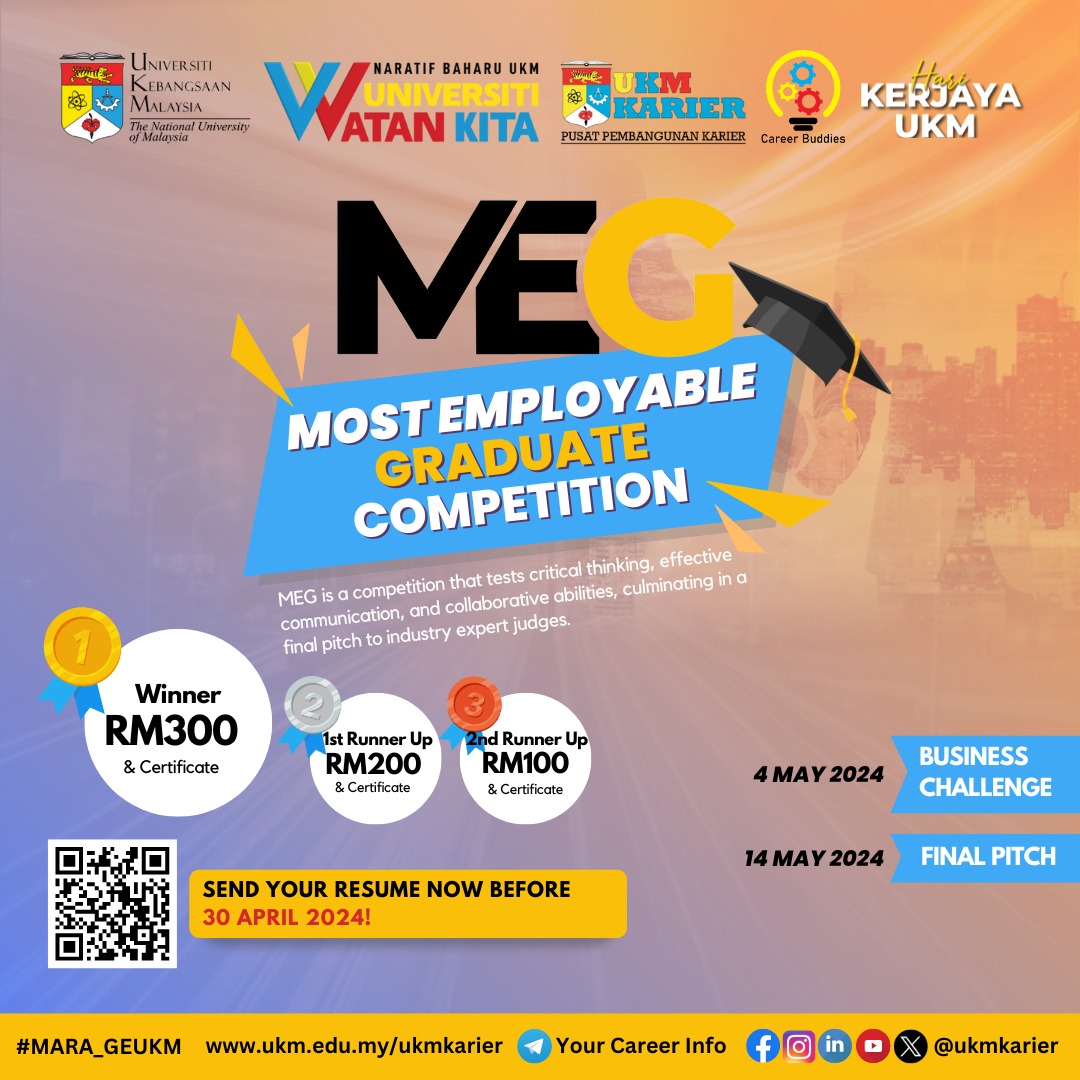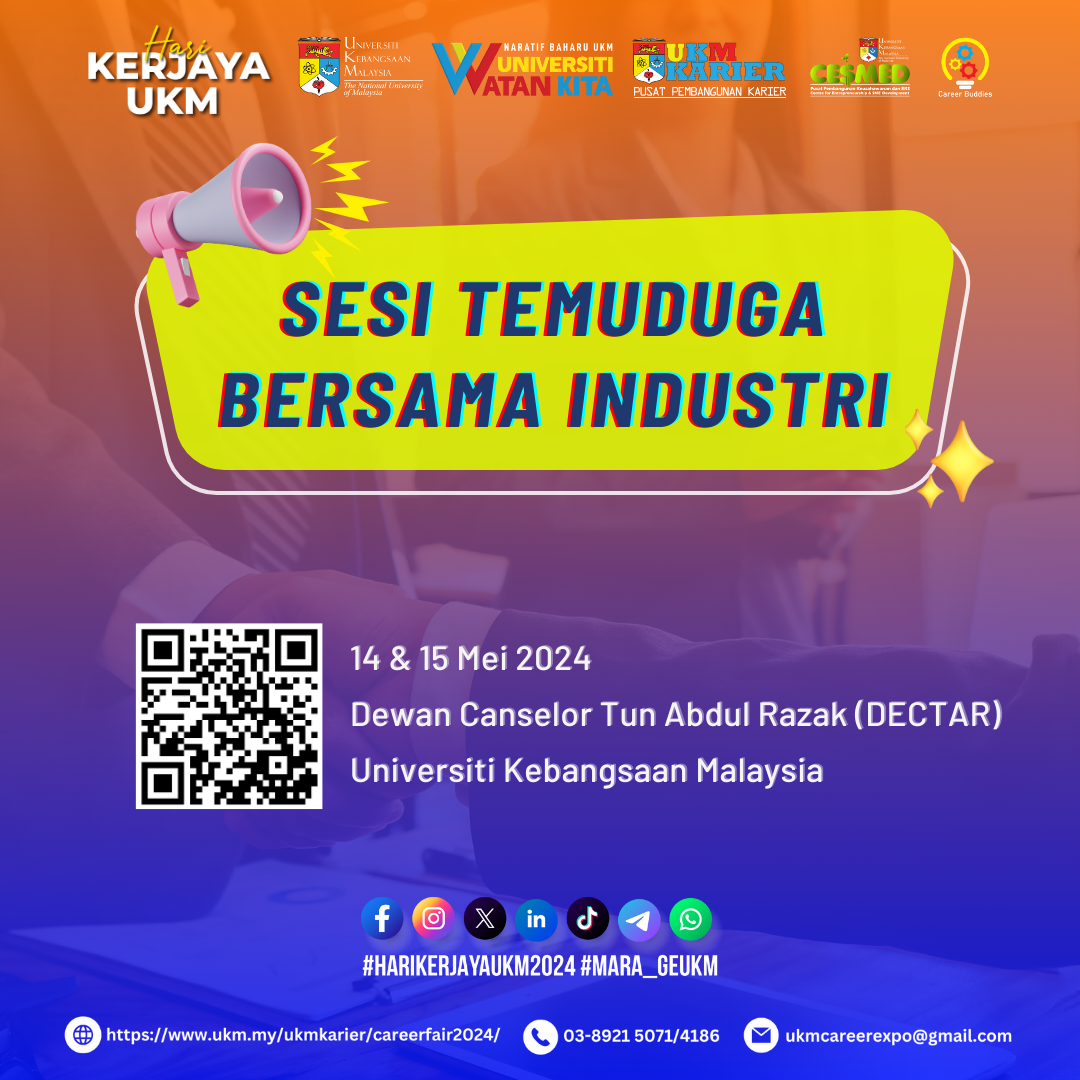 We are pleased to inform you that Universiti Kebangsaan Malaysia will be organizing UKM Career and Entrepreneurship Expo (CEE) on 14th & 15th May 2024 (Tuesday & Wednesday) at Dewan Canselor Tun Abdul Razak (DECTAR) UKM.