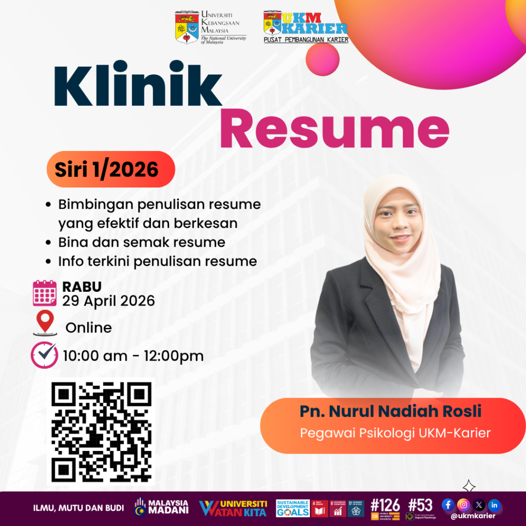 📅 Tarikh: 29 April 2026 (Rabu) 🕝 Masa: 10.00 pagi – 12.00 tengah hari 📍 Tempat : Bilik Seminar, UKM-Karier, Bangunan Pusanika