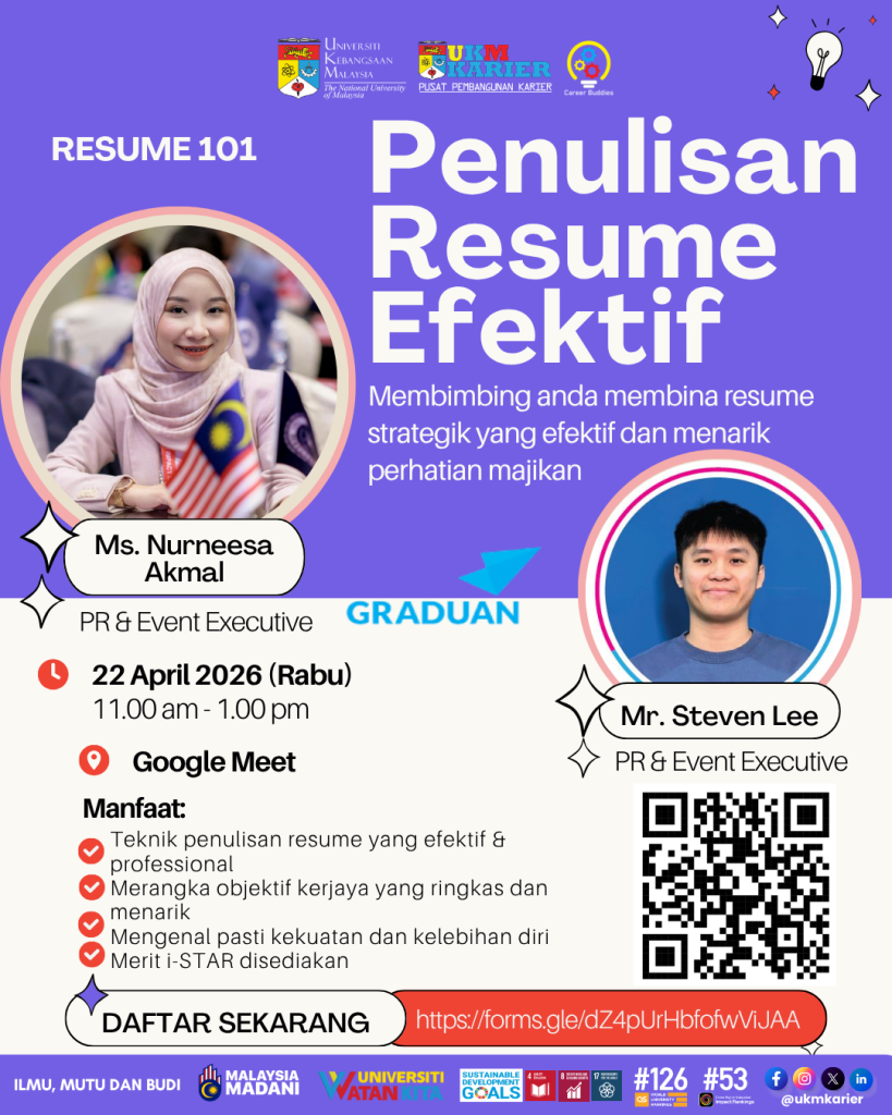 PENDAFTARAN RESUME 101 SIRI 1/2026 📢 UKM-Karier menjemput semua pelajar dan graduan! Ingin hasilkan resume yang menarik dan menonjol di mata majikan? Jom sertai Program Resume 101 Siri 1 bersama Pn. Nurneesa Akmal