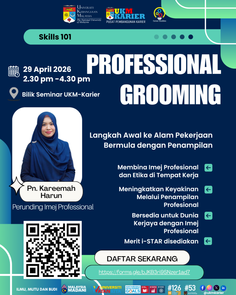 📅 Tarikh: 29 April 2026 (Rabu) 🕝 Masa: 2.30 petang – 4.30 petang 📍 Lokasi: Bilik Seminar UKM-Karier