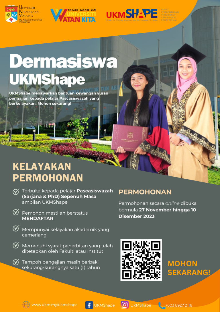 UKMShape menawarkan bantuan kewangan yuran pengajian kepada pelajar Pascasiswazah yang berkelayakan.