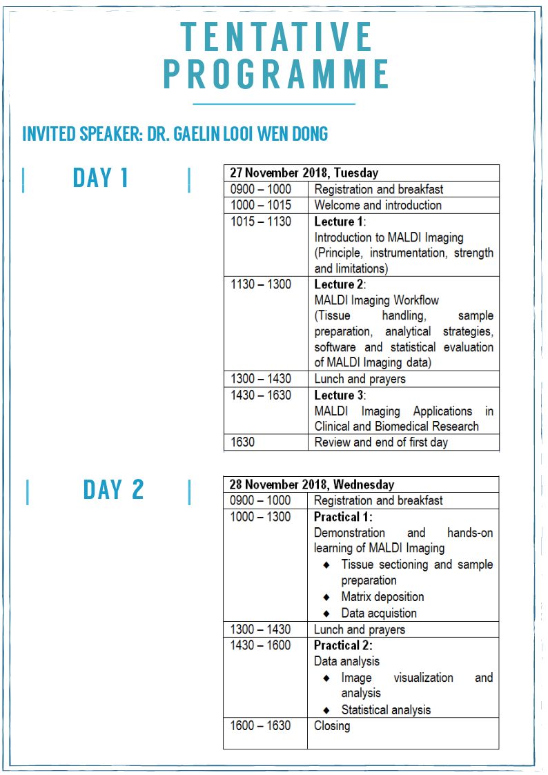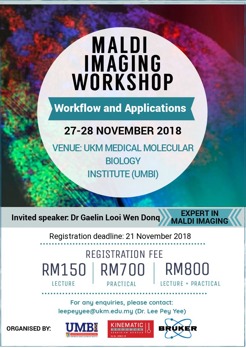 The MALDI Imaging Workshop will be held at UKM Medical Molecular Biology Institute (UMBI), Kuala Lumpur that is located just a 15-minute drive away from the heart of Kuala Lumpur city centre.