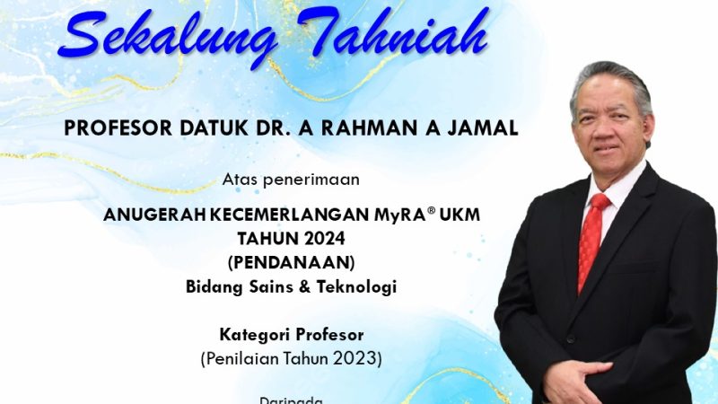 Sekalung tahniah diucapkan kepada Profesor Datuk Dr. A Rahman A Jamal atas penerimaan Anugerah Kecemerlangan MyRA UKM Tahun 2024 (Pendanaan) Bidang Sains & Teknologi …