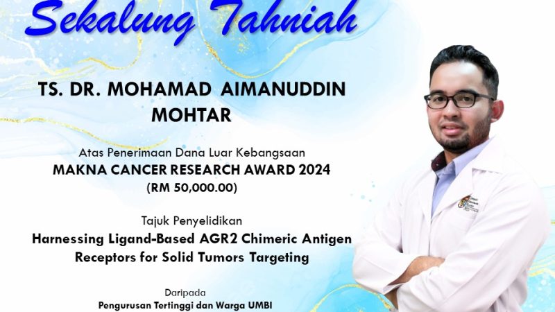Seluruh warga UMBI mengucapkan sekalung tahniah kepada Ts. Dr. Mohamad Aimanuddin Mohtar, Felo Penyelidik UMBI atas penerimaan Dana Luar Kebangsaan MAKNA Cancer Research Award 2024 …
