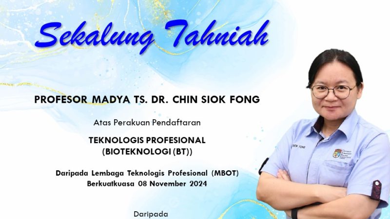 Seluruh warga UMBI mengucapkan tahniah kepada Profesor Madya Ts. Dr. Chin Siok Fong di atas perakuan pendaftaran Teknologis Profesional (Bioteknologi (BT)) daripada Lembaga Teknologis …