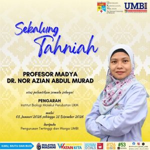 Seluruh Pengurusan Tertinggi dan Warga UMBI mengucapkan SEKALUNG TAHNIAH kepada Profesor Madya Dr. Nor Azian Abdul Murad atas pelantikan semula sebagai Pengarah UMBI mulai 1 Januari 2026 sehingga 31 Disember 2026.