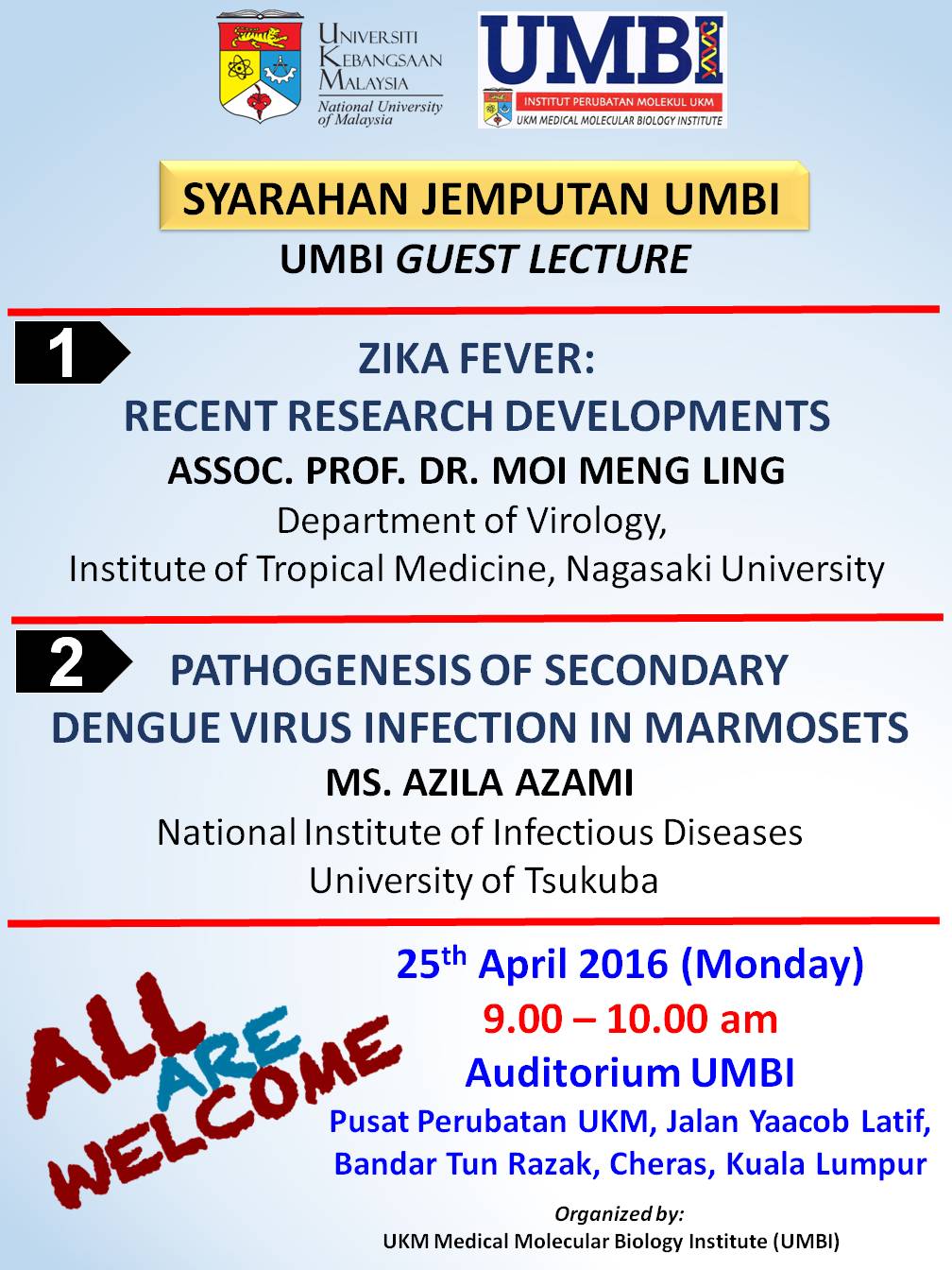 UMBI Guest Lecture – Assoc. Prof. Dr. Moi Meng Ling: “Zika Fever: Recent Research Developments” and Ms. Azila Azami: “Pathogenesis of Secondary Dengue Virus Infection in Marmosets”