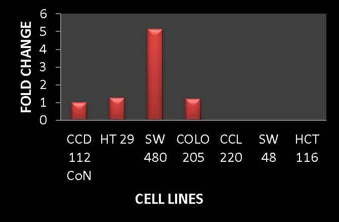 The LOC 285629 expression were assessed by RT-qPCR in colorectal cancer cell lines (HT-29, SW 480, SW 48, CCL 220, HCT 116, and COLO 205) and was compared with the normal colonic epithelial cell (CCD 112 CoN).