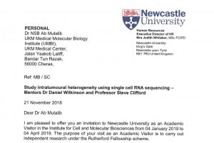 For this fellowship, Dr. Nurul Syakima will be involved in single cell RNA sequencing research on cancer at the Northern Institute for Cancer Research with Dr. Daniel Williamson as the mentor. In addition, she will also be trained in latest technology for microsatellite instability detection at the Institute of Genetic Medicine for which she will be mentored by Dr. Michael Jackson. The fellowship duration is from late December 2018 to early April 2019. UMBI wishes Dr. Syakima good luck and all the best during her stint in the UK.
