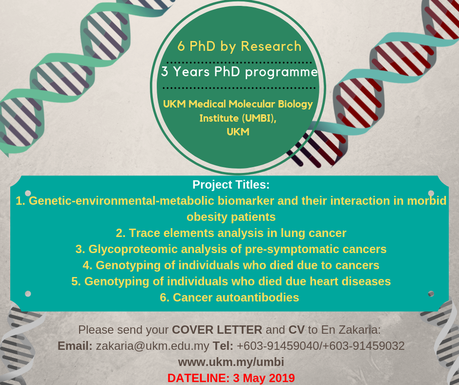 Calon yang disenarai pendek akan dipanggil untuk sesi temuduga. Kajian akan dijalankan di Institut Perubatan Molekul UKM (UMBI), Cheras, Kuala Lumpur. Calon-calon yang berminat hendaklah mengemukakan CV lengkap kepada UMBI ke alamat emel kepada En. Zakaria: zakaria@ukm.edu.my .