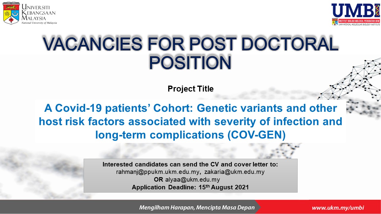 Tahniah Dr. Nor Azila Muhammad Azami Felo Penyelidik Institut Biologi Molekul Perubatan UKM (UMBI) atas penerimaan Geran Galakan Penyelidik Muda (GGPM) Tahun 2021 berjumlah RM …