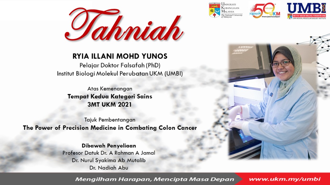 Tahniah Ryia Illani Mohd Yunos Pelajar Doktor Falsafah (PhD), Institut Biologi Molekul Perubatan UKM (UMBI) di bawah penyeliaan Profesor Datuk Dr. A Rahman A Jamal, …
