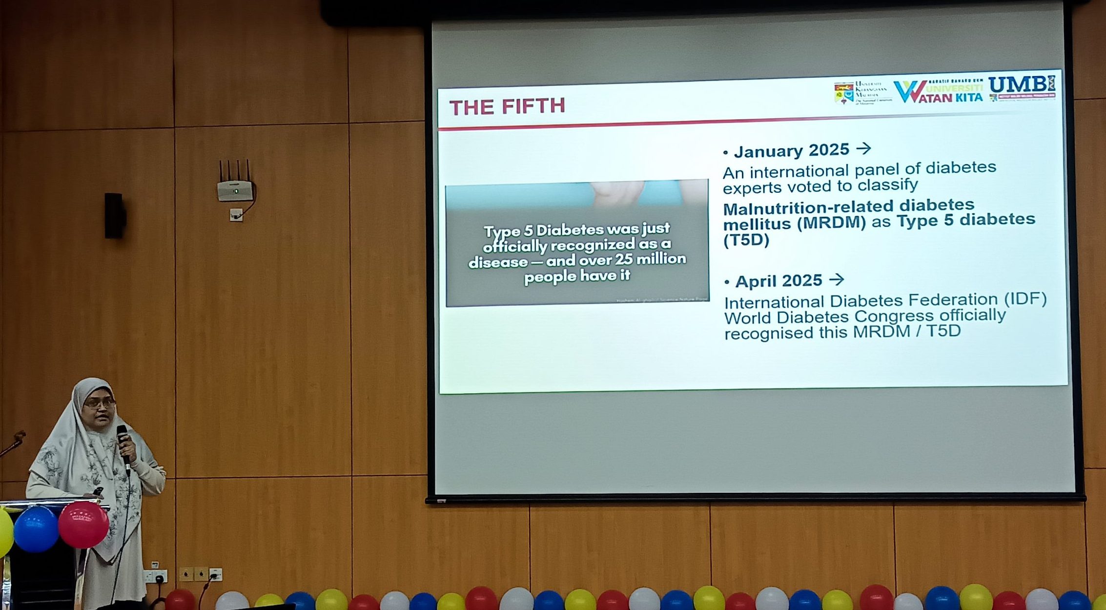 Dr. Siti Aishah Sulaiman delivered a presentation on the latest updates in Diabetes, with emphasis on the classification of types and sub-types. There are subtypes within Type 2 diabetes (T2D), and the new classification of Malnutrition-related diabetes mellitus (MRDM) as Type 5 diabetes (T5D). T5D was officially recognised by the International Diabetes Federation (IDF) in April 2025. She also discussed ethnic-related differences across the five identified subtypes: Severe Auto Immune Diabetes (SAID), Severe Insulin-Deficient Diabetes (SIDD), Severe Insulin-Resistant Diabetes (SIRD), Mild Obesity-related Diabetes (MOD), and Mild Age-Related Diabetes (MARD), with Asians are more SIDD compared to Caucasians.