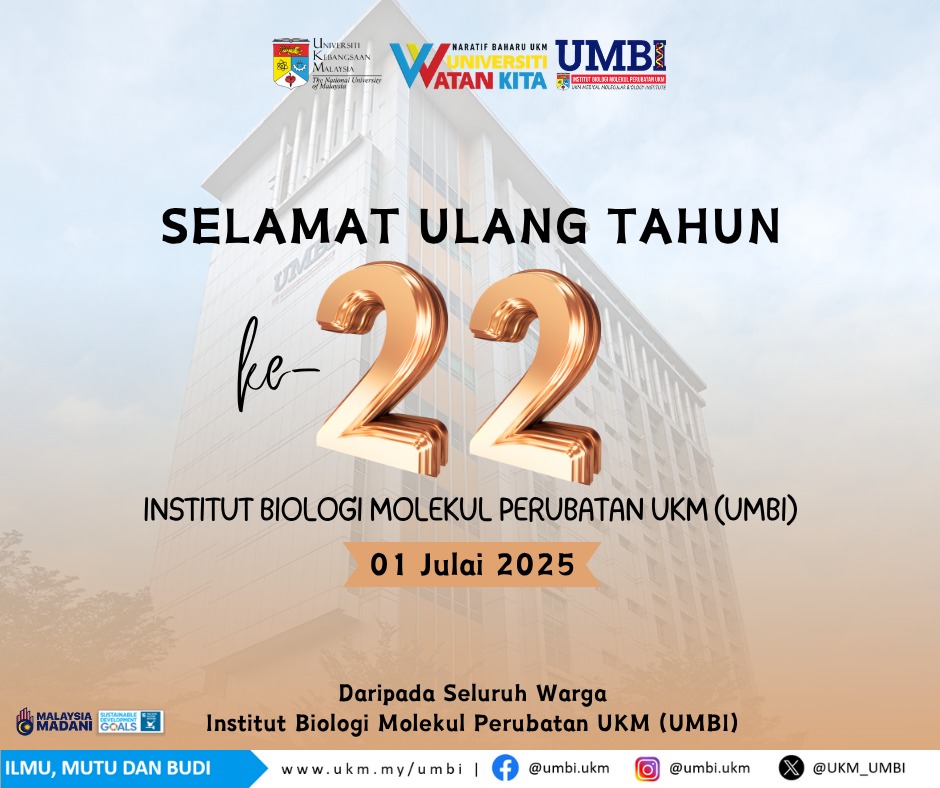 Selamat ulang tahun ke-22 kepada Institut Biologi Molekul Perubatan UKM (UMBI). Sejak penubuhannya, UMBI telah menjadi peneraju dalam penyelidikan perubatan jitu yang berimpak tinggi. Setiap pencapaian adalah hasil dedikasi dan usaha gigih seluruh warganya. Semoga UMBI terus unggul dan menyumbang kepada negara dan komuniti saintifik.