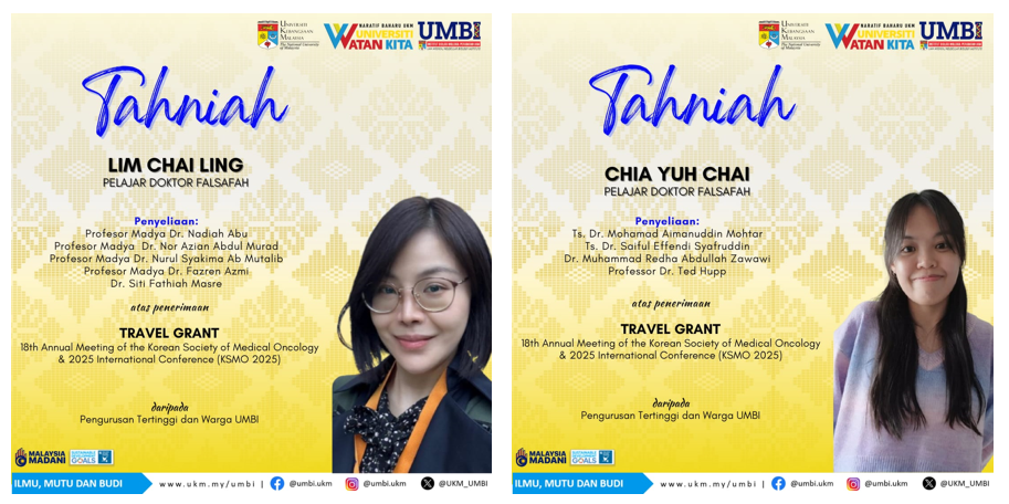 Ucapan tahniah kepada 2 orang pelajar Doktor Falsafah UMBI iaitu Lim Chai Ling dan Chia Yuh Chai yang telah menerima Geran Perjalanan (Travel Grant) 18th Annual Meeting of the Korean Society of Medical Oncology & 2025 International Conference (KSMO 2025).