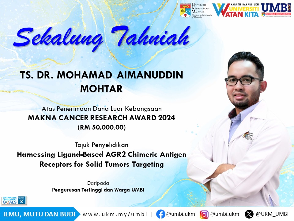 Seluruh warga UMBI mengucapkan sekalung tahniah kepada Ts. Dr. Mohamad Aimanuddin Mohtar, Felo Penyelidik UMBI atas penerimaan Dana Luar Kebangsaan MAKNA Cancer Research Award 2024 yang berjumlah RM 50,000.00.