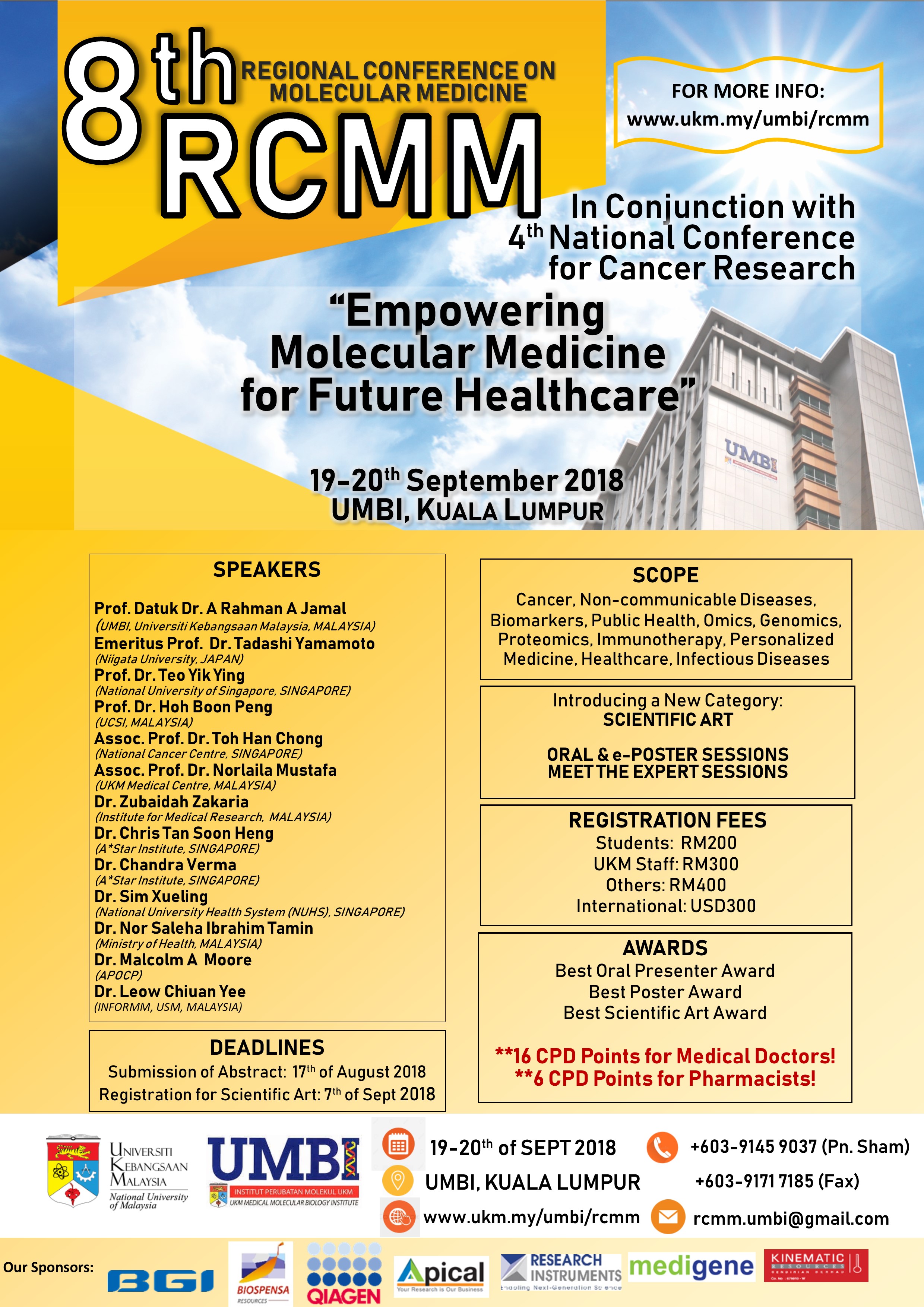 The 8th RCMM conference will be held at UKM Medical Molecular Biology Institute (UMBI), Kuala Lumpur that is located just a 15-minute drive away from the heart of Kuala Lumpur city centre. For more information about the venue, please visit the UMBI website here.
