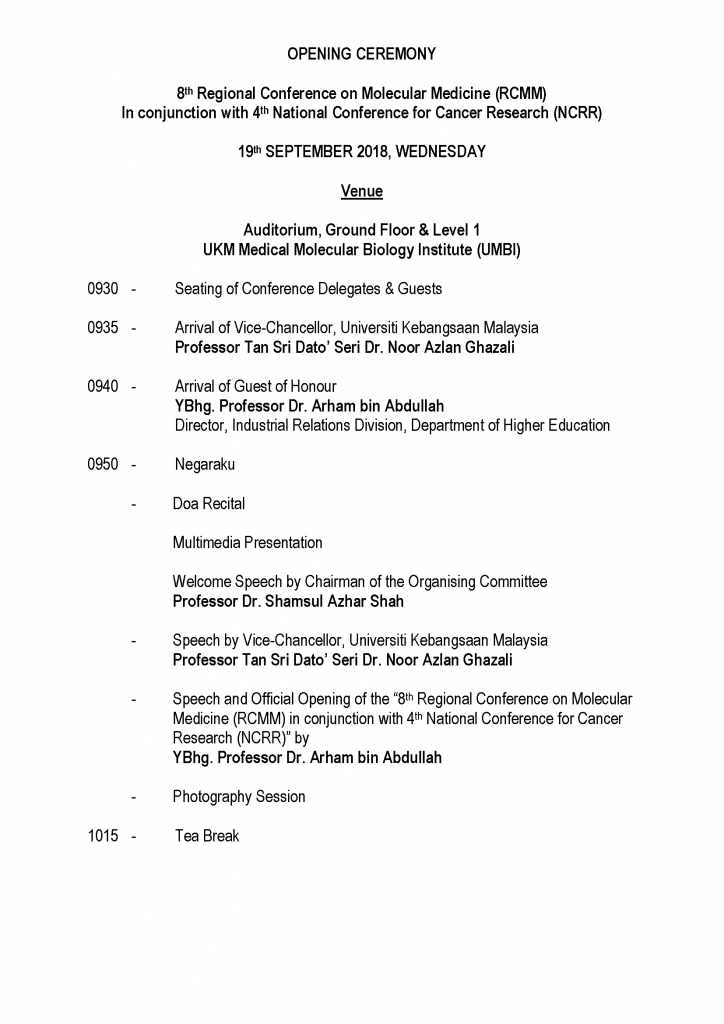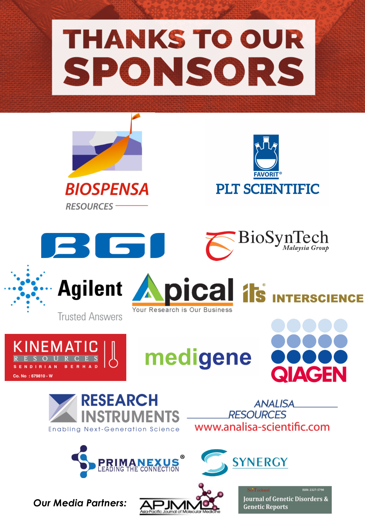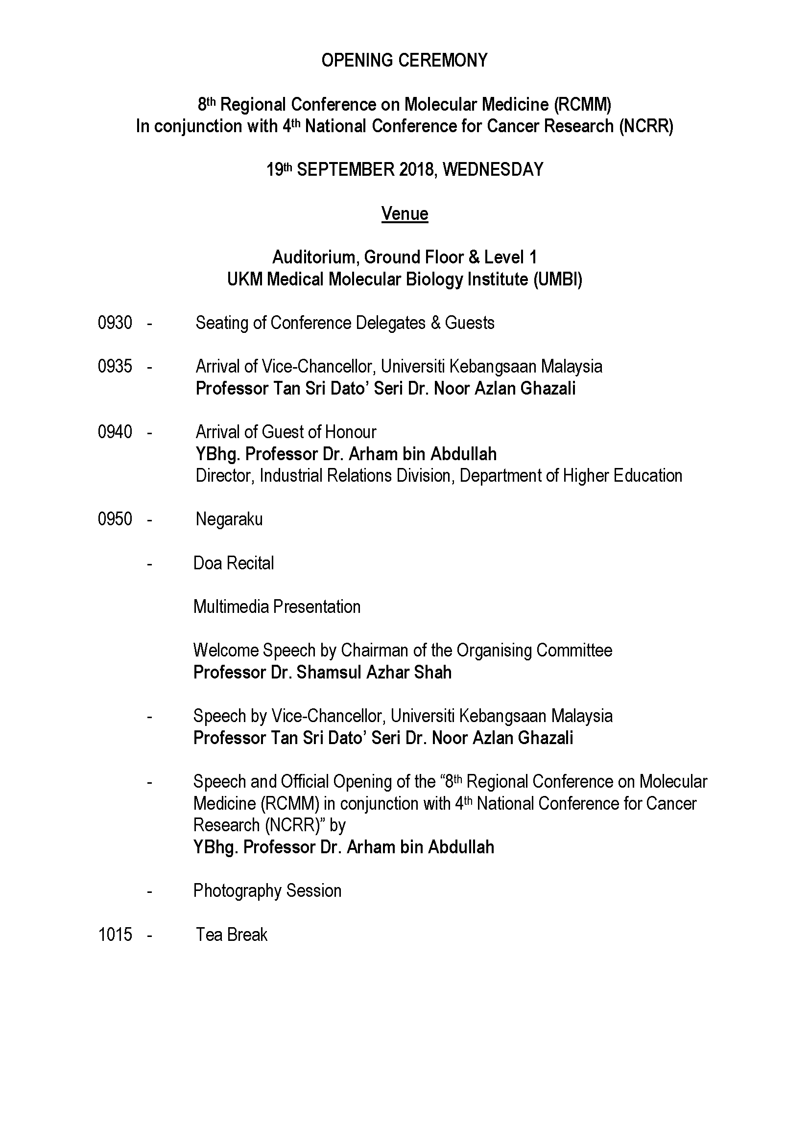 (Director, Industrial Relations Division, Department of Higher Education)10.15 AM - 10.45 AM Tea Break 10.45 AM - 12.30 PM Symposium 1 Current perspectives in cancer biomarkers, prognostication, control and treatment Chairperson: Dr. Nurul Syakima Ab Mutalib (i) Speaker 1 Current perspectives in biomarkers for nasopharyngeal carcinoma (NPC) Speaker: Associate Prof Dr. Edmund Sim Ui Hang (Faculty of Resource Science and Technology (FRST), Universiti Malaysia Sarawak (UNIMAS), Malaysia) (ii) Speaker 2 Molecular characterization of Acute Lymphoblastic Leukaemia : Research Update Speaker: Dr. Zubaidah Zakaria (Institute for Medical Research (IMR), Malaysia) (iii) Speaker 3 Cancer-Prevention and Control Speaker: Dr. Nor Saleha (Ministry of Health (MOH) Malaysia, Malaysia) (iv) Speaker 4 10X Genomics : Revealing the True Biology of Cancer Speaker: Dr. Leo Chan (Sponsored by Research Instrument Sdn. Bhd., Malaysia) 12.30 PM - 2.00 PM Lunch & Meet The Expert Session 2.00 PM - 3.30 PM Symposium 2 Personalized medicine and public health approach in non-communicable diseases Chairperson: Dr. Nor Azian Abd Murad (i) Speaker 1 Non-glycemic lowering of HbA1c in Asian populations: Implications for Type 2 Diabetes diagnostics Speaker: Assistant Professor Dr. Sim Xueling (National University of Singapore (NUS), Singapore) (ii) Speaker 2 Challenges and Opportunities in Managing T2DM Speaker: Assoc Prof Dr. Norlaila Mustafa (Endocrinology Unit, UKM Medical Center, Malaysia) (iii) Speaker 3 Precision Medicine: the barriers and facilitators to clinical implementation Speaker: Prof. Teo Yik Ying (Saw Swee Hock School of Public Health, National University of Singapore (NUS), Singapore) (iv) Speaker 4 Epidemiology of cancer in South-East Asia Speaker: Dr. Malcolm Moore (Asian Pacific Education (APE) Press Co., Ltd, Thailand) 3.30 PM - 4.15 PM Plenary 2 Urine Proteomics towards Future Healthcare by All-in-One Urine Test Speaker: Emeritus Professor Dr. Tadashi Yamamoto (Biofluid Biomarker Center, Niigata University, Japan) Chairperson: Dr. Ezanee Azlina Mohd Hanif 4.15 PM - 5.00 PM Tea Break Day 2 - Thursday 20 September 2018 8.00 AM - 10.30 AM Free Paper Chairperson: Dr. Tan Shing Cheng & Dr. Noraidatulakma Abdullah @ Muda 10.30 AM - 11.00 AM Tea Break 11.00 AM - 12.30 PM Symposium 3 Omics technologies and health care: An update Chairperson: Associate Professor Dr. Low Teck Yew (i) Speaker 1 Comprehensive Profiling of Drug Response in Patient-derived Tumor Spheroids Speaker: Dr. Judice Koh Lie Yong (Genome Institute of Singapore (GIS), Agency for Science, Technology and Research (A*STAR), Singapore) (ii) Speaker 2 Darwinian Medicine: "Bridging the Evolution to Genome Medicine" Speaker: Professor Dr. Hoh Boon Peng (Faculty of Medicine & Health Sciences, UCSI University, Malaysia) (iii) Speaker 3 Vaccinomics for the human carcinogenic parasitic infections Speaker: Dr. Leow Chiuan Yee (Institute for Research in Molecular Medicine (INFORMM), Universiti Sains Malaysia (USM), Malaysia) (iv) Speaker 4 Computational Explorations for Precision Medicine Speaker: Dr. Chandra Verma (Bioinformatics Institute (BII), Agency for Science, Technology and Research (A*STAR), Singapore) 12.30 PM - 2.00 PM Lunch & Meet The Expert Session 2.00 PM - 2.45 PM Plenary 3 The Concept of Bacterial Gene Essentiality in the Search for New Antimicrobial Targets Speaker: Professor Dr. Sheila Nathan (Faculty of Science & Technology, Universiti Kebangsaan Malaysia (UKM), Malaysia) Chairperson: Associate Professor Dr. Neoh Hui-min 2.45 PM - 3.30 PM Plenary 4 The Malaysian Cohort: Trends of prevalence and mortality of NCDs Speaker: Professor Datuk Dr. A Rahman A Jamal (UKM Medical Molecular Biology Institute (UMBI), Universiti Kebangsaan Malaysia (UKM), Malaysia) Chairperson: Dr. Chin Siok Fong 3.30 PM - 4.00 PM Closing Ceremony 4.00 PM - 5.00 PM Tea Break -