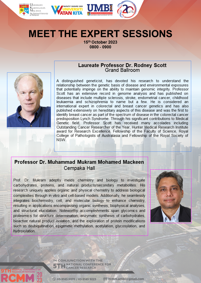 On behalf of the organizing committee, we would like to extend our warmest invitation to you to participate in the upcoming 9th Regional Conference on Molecular Medicine (RCMM) in conjunction with the 5th National Conference for Cancer Research (NCCR), scheduled to take place on 14th – 15th October 2023 at the Bangi Resort Hotel, Selangor.