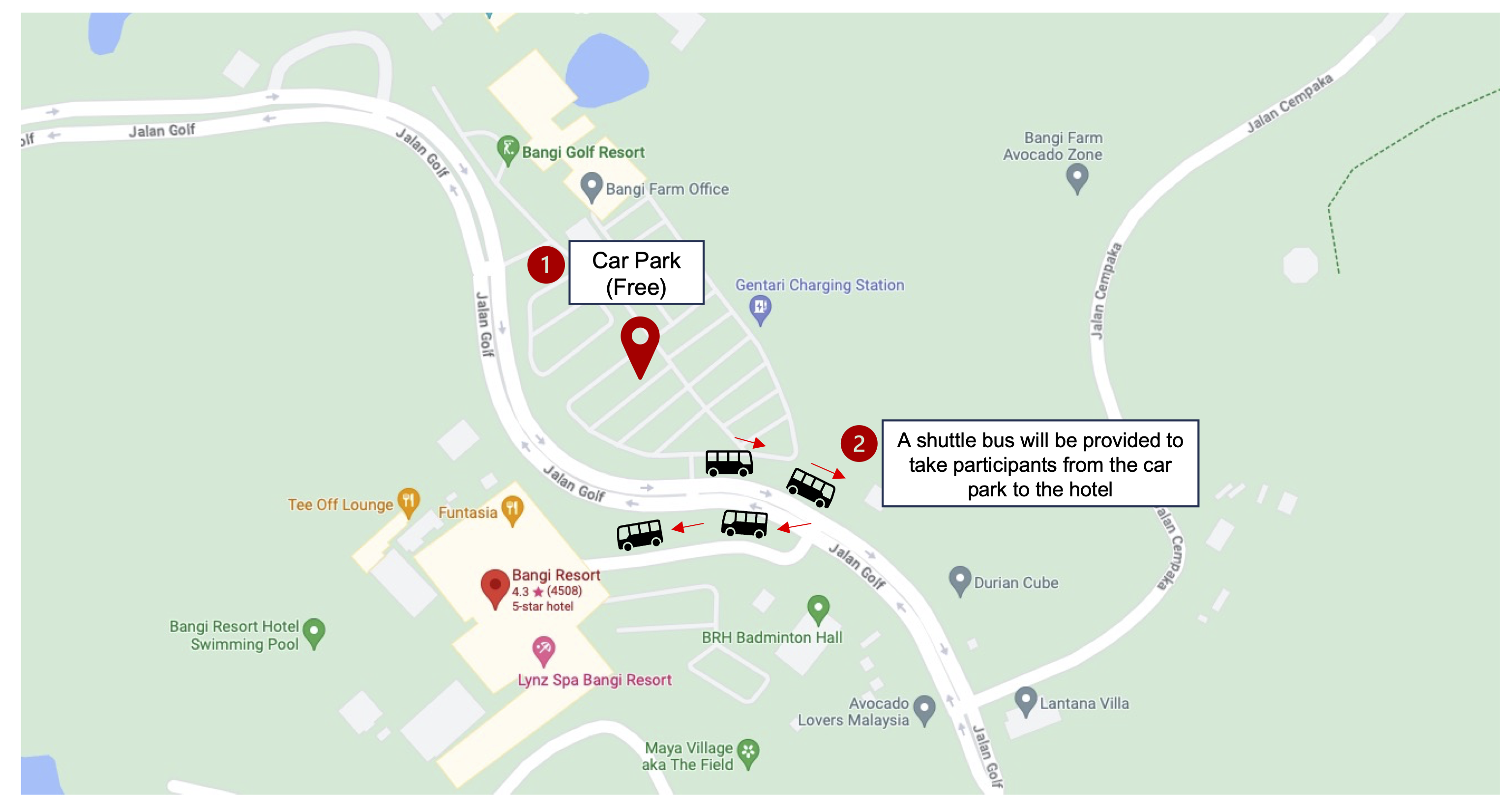 - From the Bangi station, take a taxi or a Grab car to the Bangi Resort Hotel. The distance from the station to the resort is about 9 kilometers, and the journey should take around 15 minutes, depending on traffic.