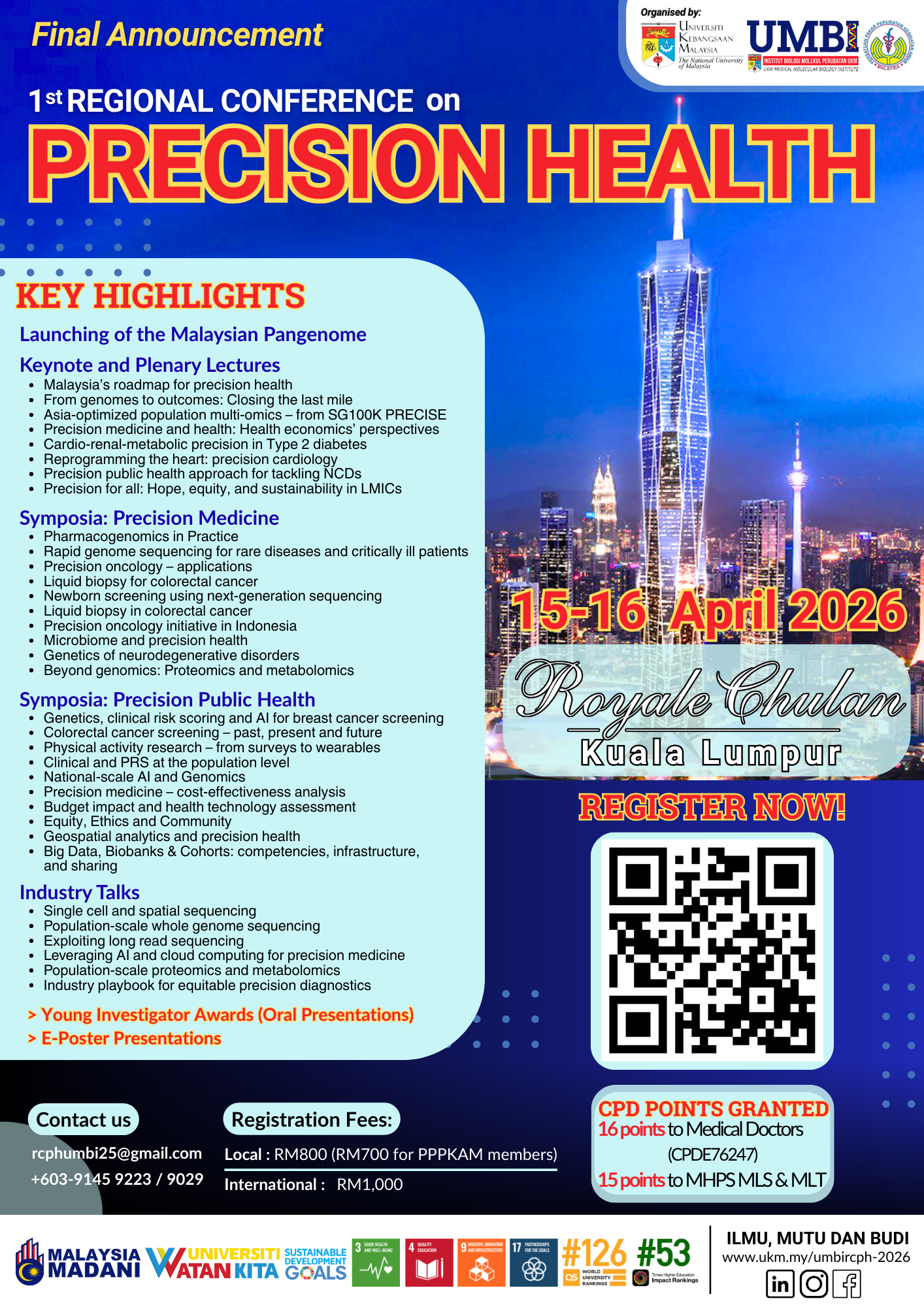 The UKM Medical Molecular Biology Institute (UMBI) in collaboration with the Malaysian Society of Public Health Physicians, proudly presents the first regional meeting that brings Precision Medicine and Precision Public Health together on one stage. Our aim is simple and urgent: turn cutting-edge science and research into equitable, real-world impact across the Asia Pacific.