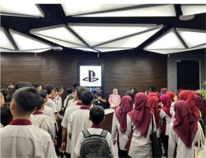 Rajah 2 Pelajar mendengar penerangan tentang proses pembangunan permainan digital semasa lawatan industri ke studio permainan.