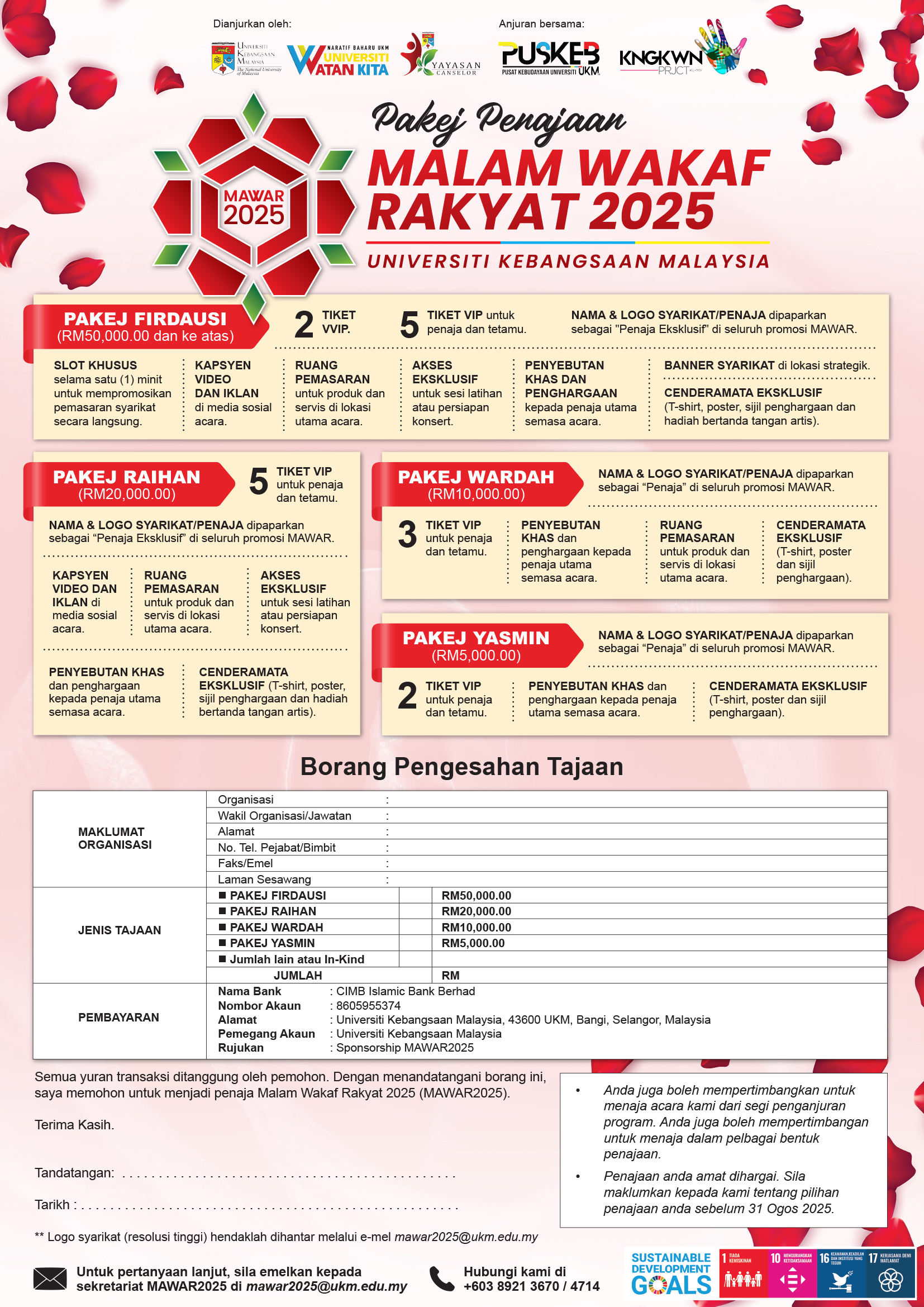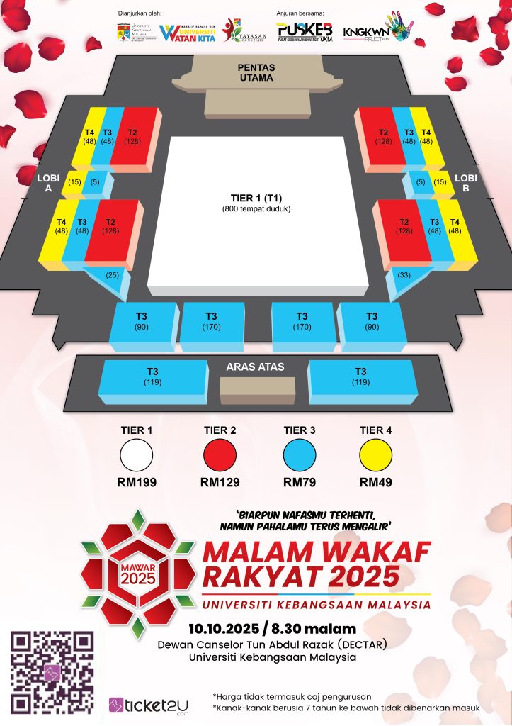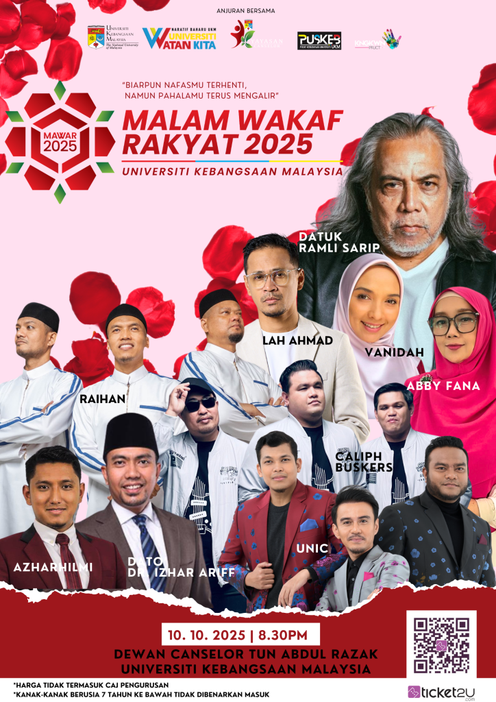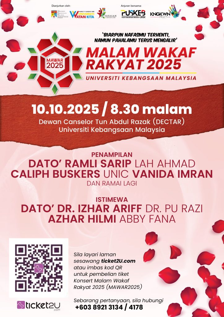 Yayasan Canselor UKM dengan kerjasama PUSKEB UKM dan Kengkawan Project berbesar hati mempersembahkan Konsert Malam Wakaf Rakyat 2025 (MAWAR) dengan kerjasama Yayasan Canselor UKM dan PUSKEB yang bakal diadakan pada 10.10.2025 di Dewan Canselor Tun Abdul Razak (DECTAR) jam 8.30mlm.