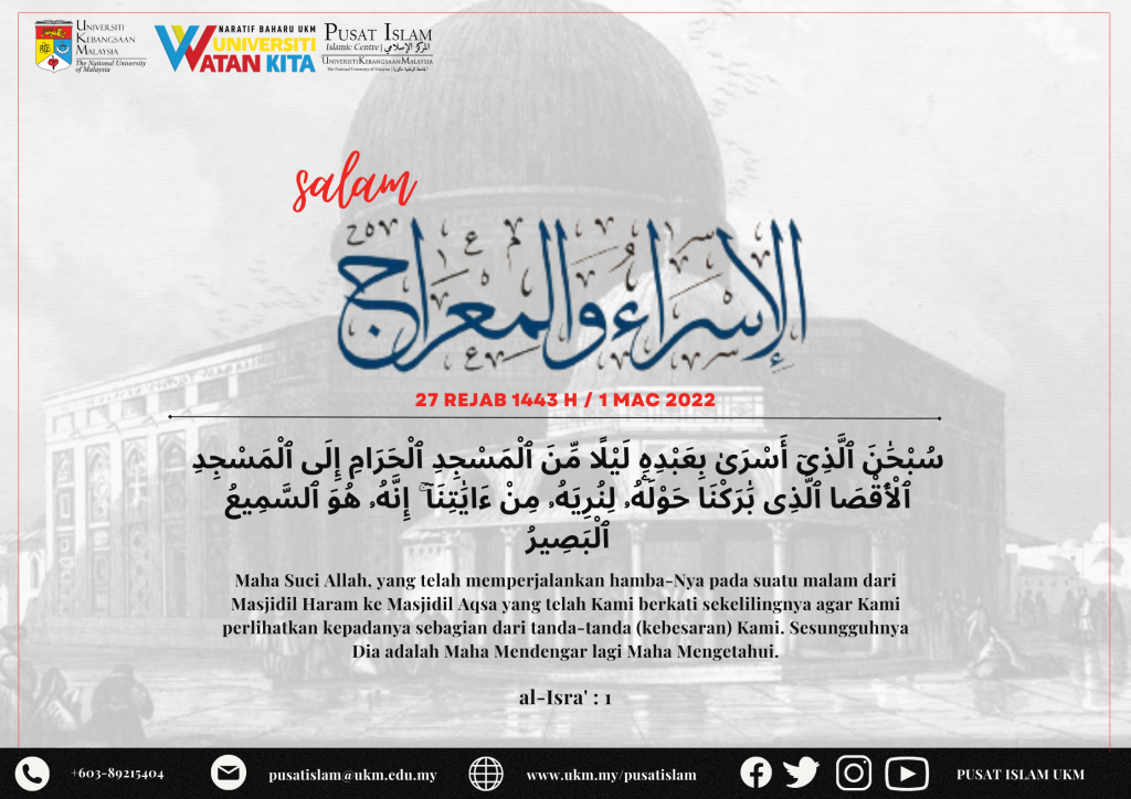 Warga Pusat Islam UKM mengucapkan Salam Israk Mikraj kepada semua Warga Universiti dan Masyarakat Islam seluruh Malaysia. Marilah bersama-sama menghayati Peristiwa tersebut agar kita dapat memperbaiki ibadah solat dan menghargai pengorbanan Baginda Nabi Muhammad SAW dengan kasih sayang yang sebenarnya. Semoga segala usaha kita memperoleh keberkatan serta ganjaran di dunia dan di akhirat.