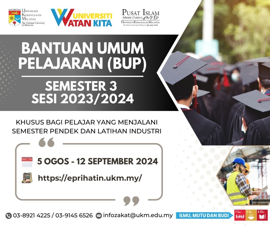 Sukacita dimaklumkan bahawa permohonan zakat Bantuan Umum Pelajaran (BUP) Semester 3 Sesi 2023/2024 khusus untuk pelajar yang menjalani Semester Pendek dan Latihan Industri telah dibuka.