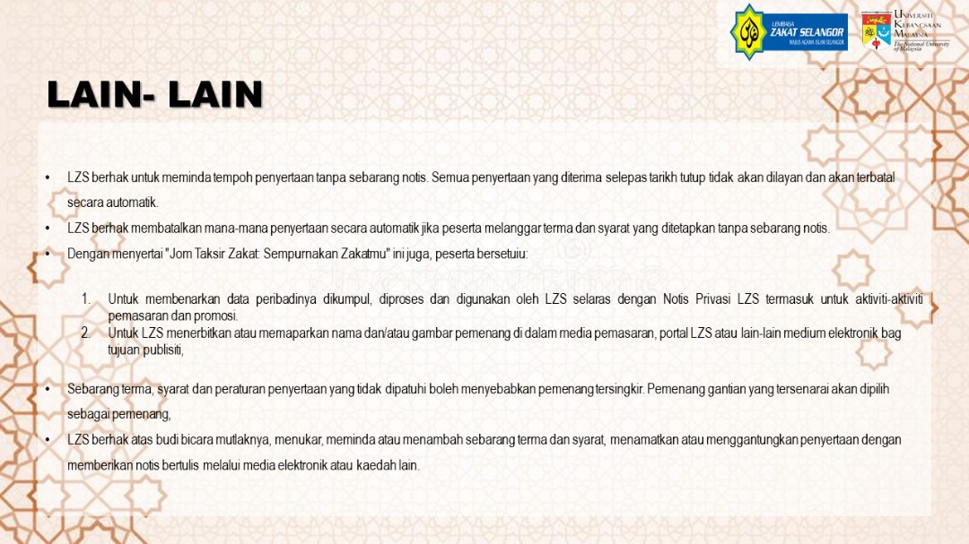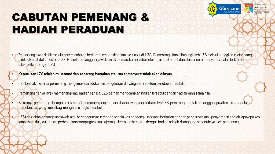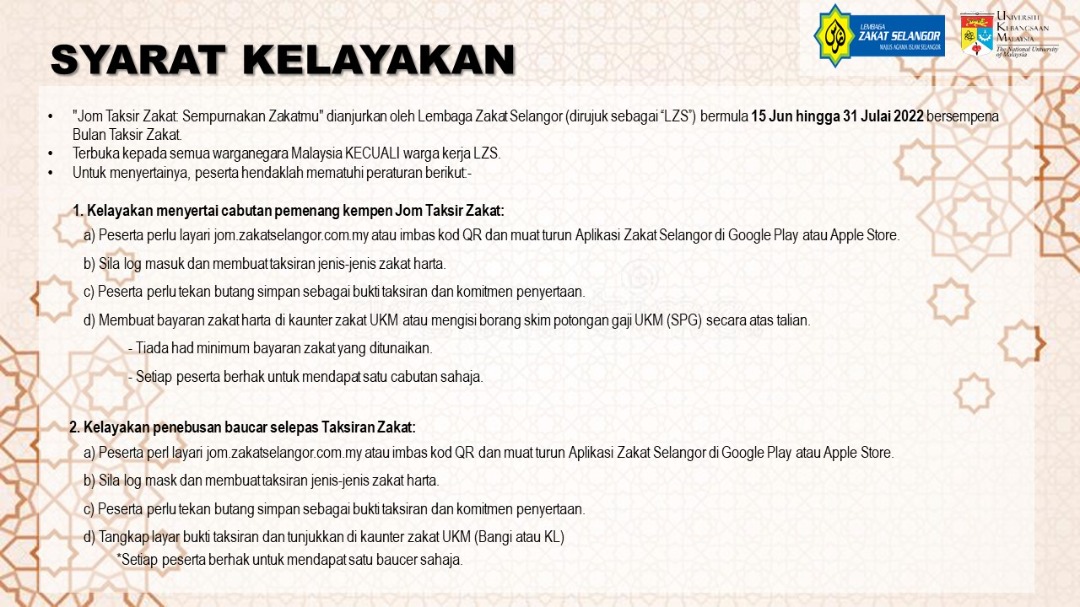 JOM TAKSIR ZAKAT DI KAUNTER ZAKAT UKM BERSEMPENA BULAN TAKSIR ZAKAT TAHUN 2022 | BERMULA 15 JUN – 31 JULAI ! Cepat jangan lepaskan peluang. Anda berpeluang memenangi hadiah yang menarik ! Untuk maklumat lanjut rujuk poster dibawah:
