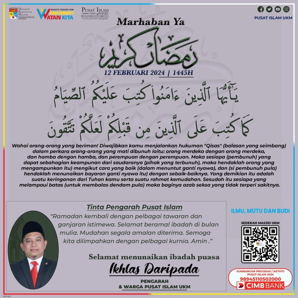 Seluruh warga kerja Pusat Islam UKM mengucapkan selamat menunaikan ibadah berpuasa fardhu sebulan.