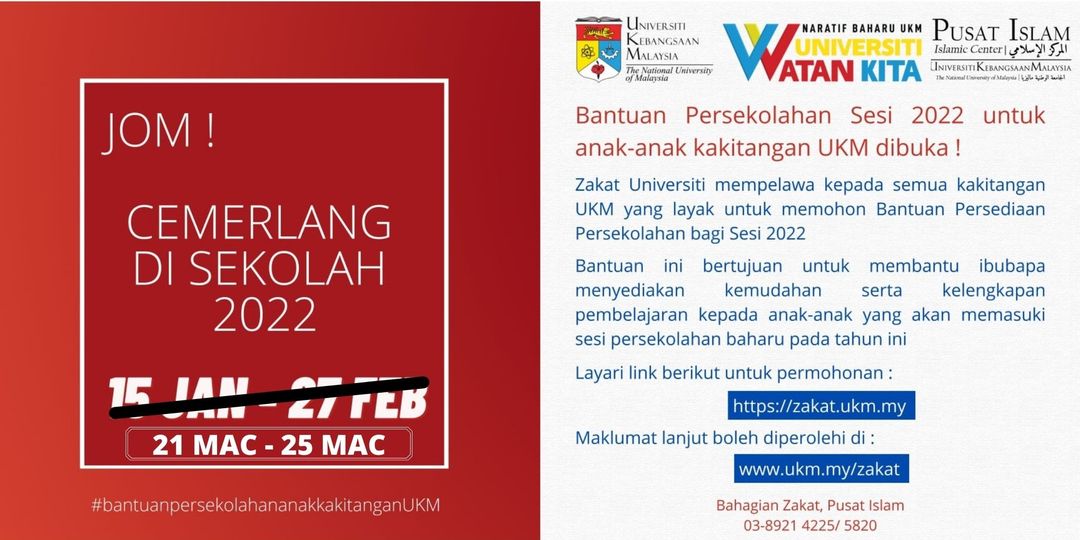 Zakat Universiti mempelawa kepada semua kakitangan UKM untuk memohon BANTUAN ZAKAT PERSEKOLAHAN SESI 2022 BAGI ANAK-ANAK KAKITANGAN UKM. Permohonan perlu dibuat melalui atas talian URL …