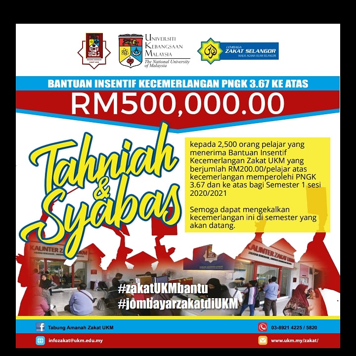 ?Tahniah diucapkan kepada 2500 pelajar UKM yang telah memperolehi keputusan cemerlang 3.67 dan ke atas pada semester 1 sesi 2020/2021. Pelajar akan menerima Insentif Kecemerlangan …